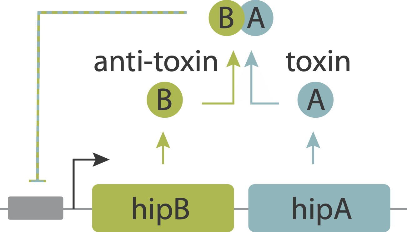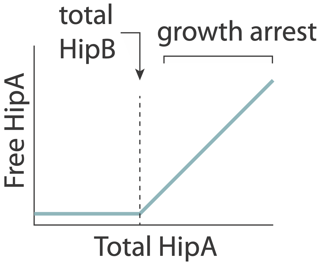 In this system, the toxin, hipA, and the antitoxin, hipB, are expressed from a single operon. The two proteins form a complex that negatively autoregulates their own expression. Because the two proteins associate very tightly they operate in a molecular titration regime in which the the anti-toxin effectively “subtracts away” toxin molecules. The excess of HipA proteins over HipB proteins represents the amount of active toxin. At high enough levels, this free HipA can trigger a dormant, growth-arrested state. Cells exit from this state after long and broadly distributed lag times of hours to days.