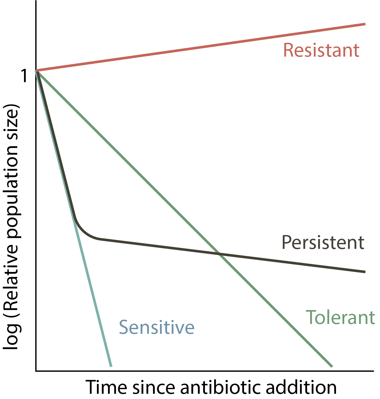 Survival curves provide a way to distinguish among several possible behaviors. Assuming antibiotics are added at time 0, a resistant mutant would continue to grow, while a sensitive population would exponentially die out. Tolerant mutants are still sensitive but die at a lower rate. Persistence is characterized by a biphasic survival curve: initially the population decays rapidly, similar to the sensitive population. However, the persistent subpopulation ultimately limits the killing, as shown schematically here.