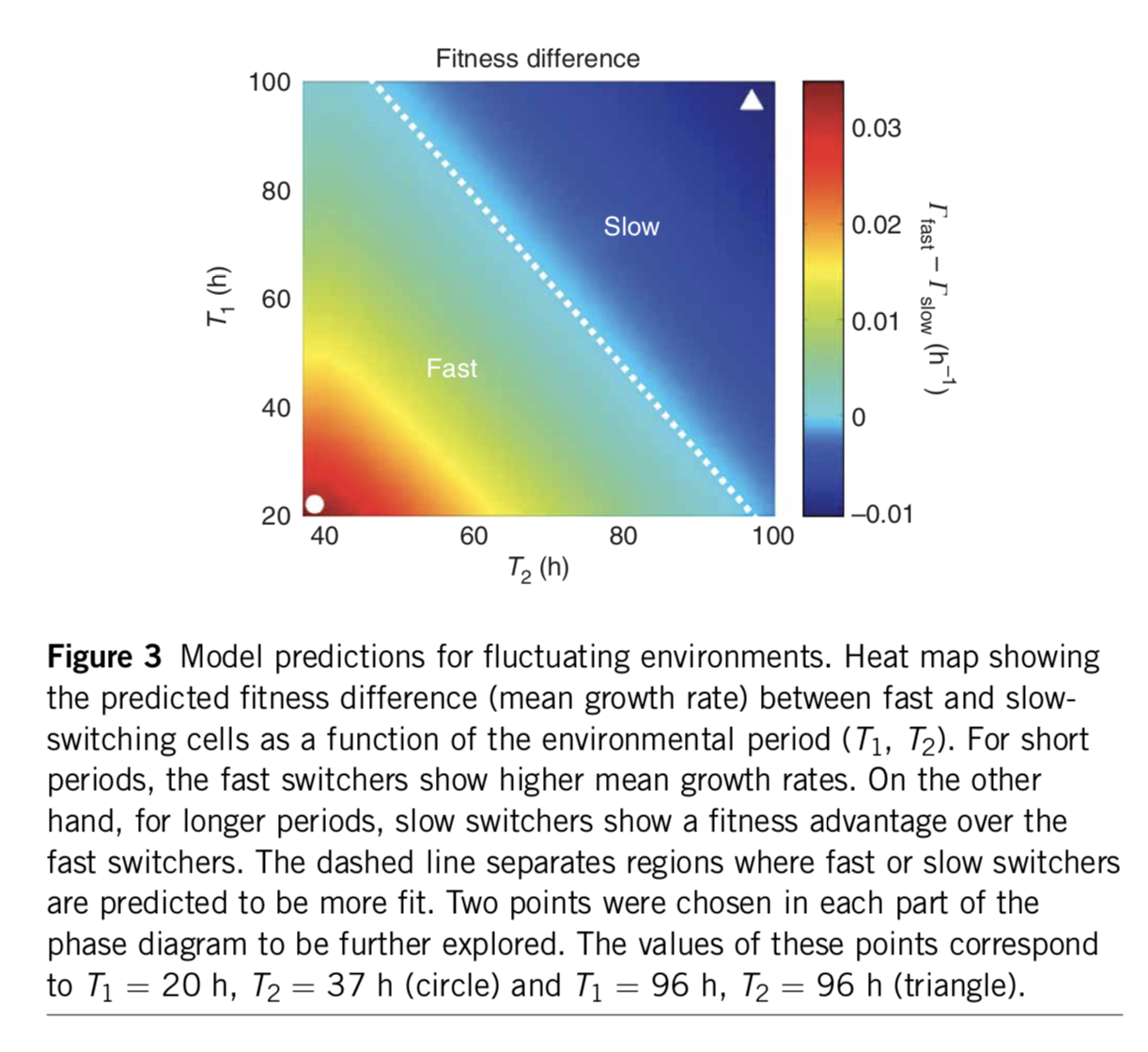 Analyzing this model shows that the optimal switching rate depends on the switching rates of the environment. In this paper, the authors compare to a specific experimental realization of this system in two yeast strains that have been engineered to switch at different rates. As shown here, the difference in mean growth rates between the fast and slow switching strains depends on the switching rates of the environment:
