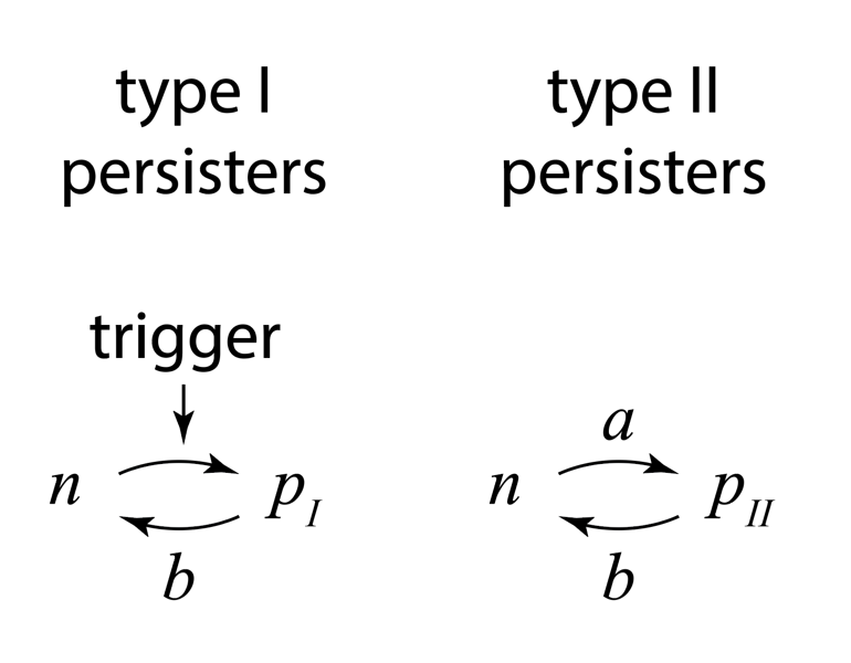 Through the movies and many other experiments, the authors identified two types of persisters: Those that are formed in response to a triggering event, termed type I persisters, and those that are formed spontaneously, even in constant conditions, and even in the absence of the drug, termed type II persisters. They summarized the two types of behavior with this diagram: