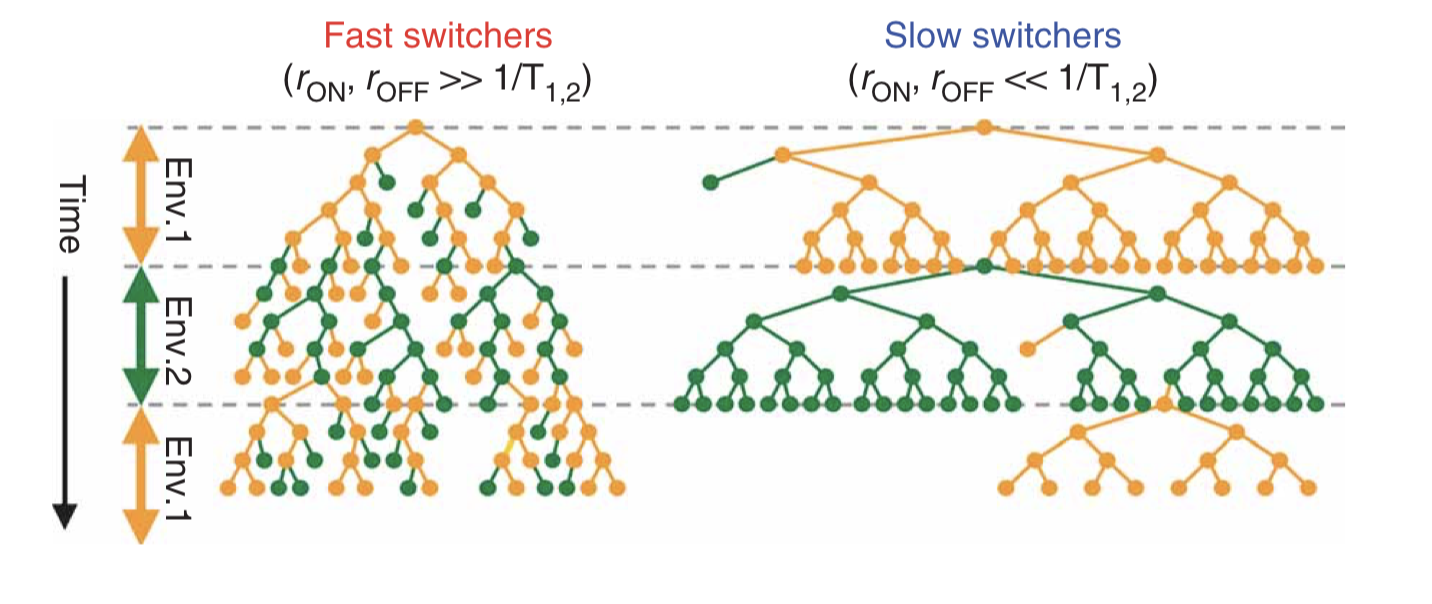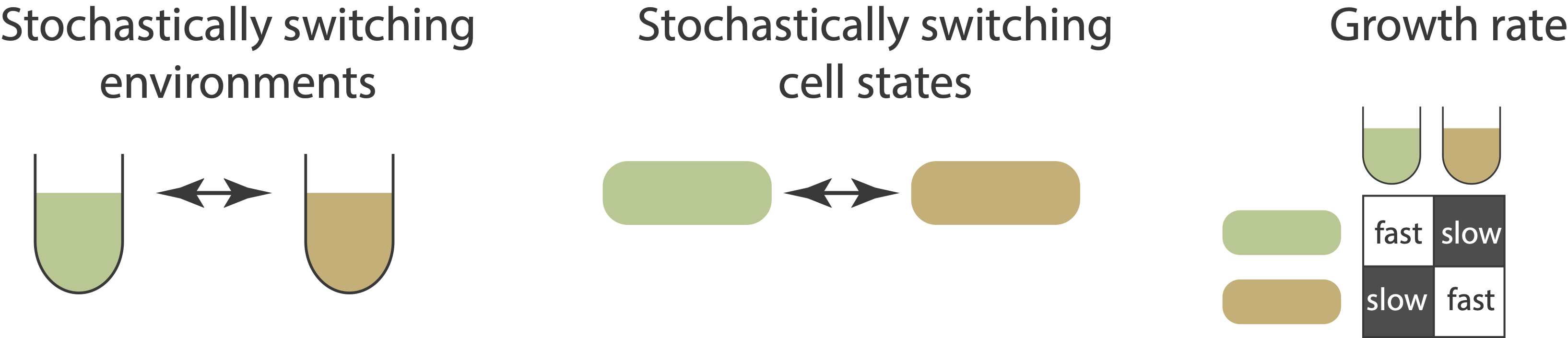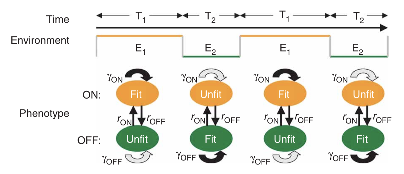 The simplest stochastic state switching system we can imagine is one with two environments and cell types, with each cell type better adapted to a distinct environment: