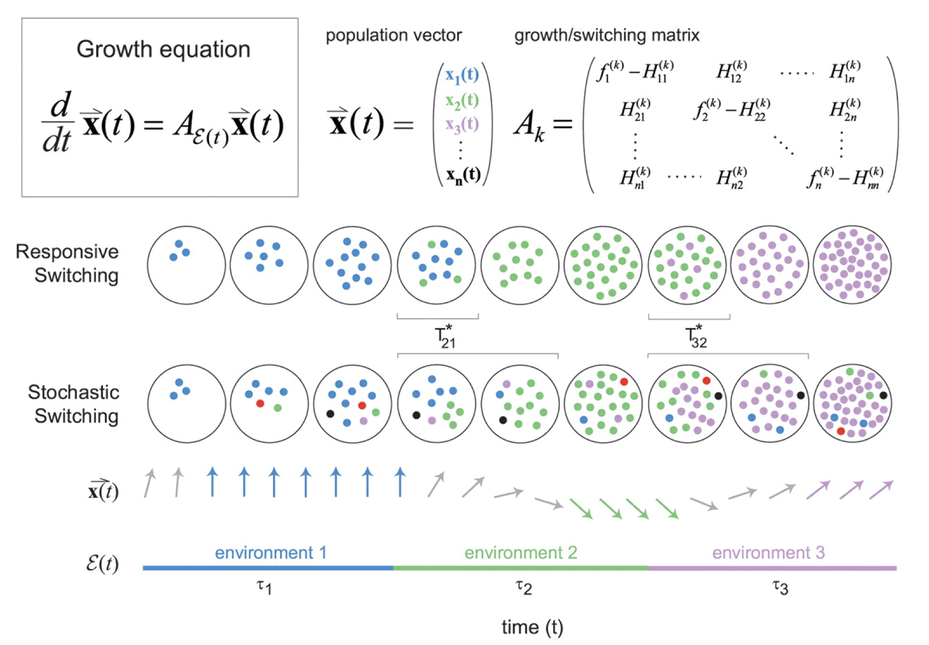 The dynamics are then described by a set of equations for the size of each cell state population, collected together in a cellular state vector, \(\mathbf{x}\). The dynamics of \(\mathbf{x}\) depend in turn on the environments, the switching rates, and the growth rates of each cell state in each environment, all collected together into the matrix \(\mathbf{A_k}\) as shown in the diagram above.