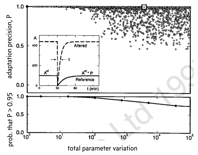 To make clear the overlapping points in the top plot, the bottom plot shows the fraction of parameter sets for which the precision of adaptation \(P < 0.95\) for various values of the total parameter variation \(K\). These plots demonstrate that even over large degrees of parameter variation, up to a total of four or five orders of magnitude, the system can still achieve rather exact adaptation.