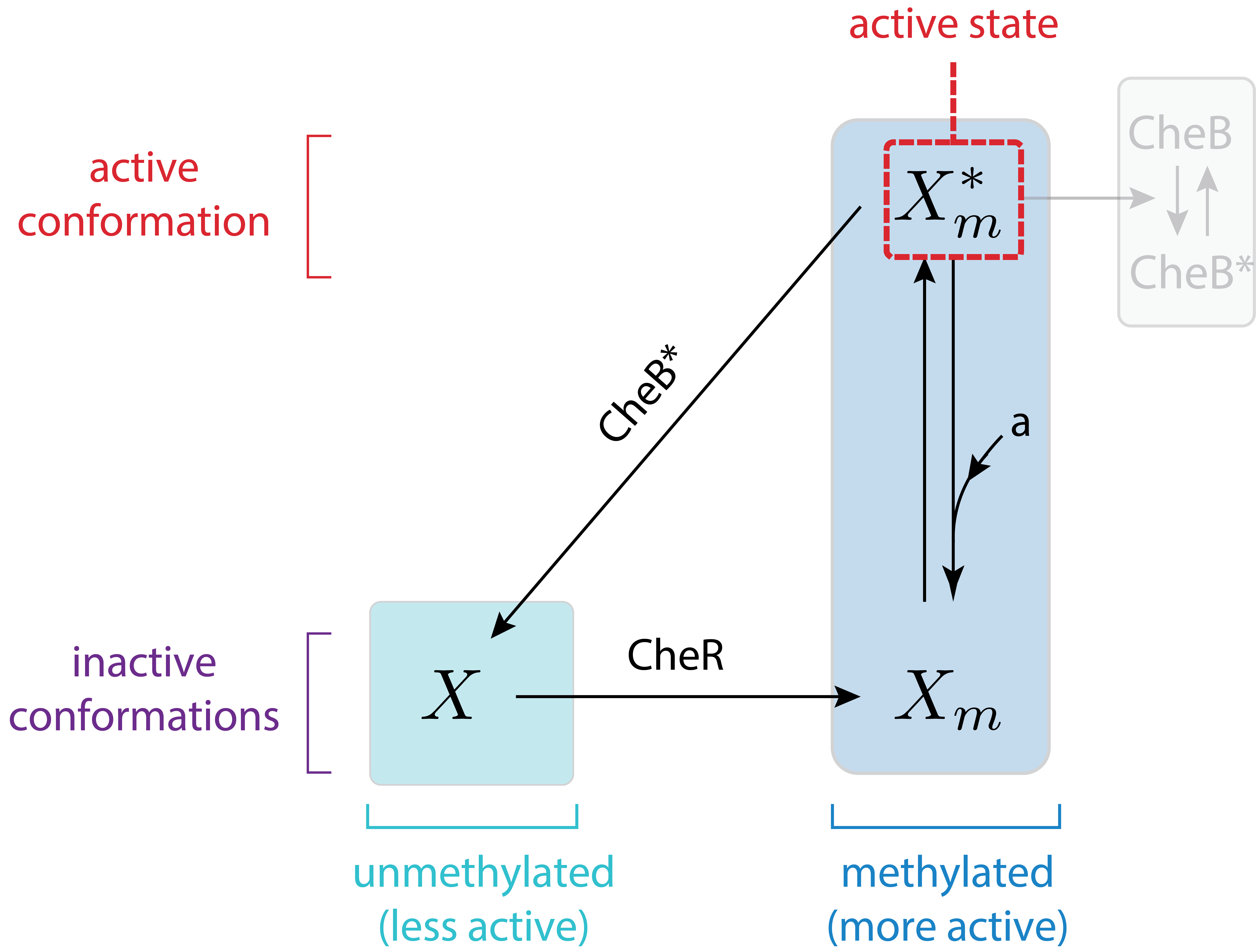 Here, we have identified four distinct states of the CheA receptor. It can be methylated or unmethylated. Receptor complexes in each methylation state can also be in more or less active conformations. Ligands shift the bias between the conformations. These four states can be denoted \(X\), \(X_m\), \(X^*\), and \(X_m^*\), with the subscript \(m\) denoting methylation state, and superscript \(*\) denoting the more active conformational state. We use lower case variables, \(x\), \(x_m\), \(x^*\), and \(x^*_m\), to denote the concentrations of complexes in the corresponding states. (Finally, we note that while we are considering a simplified case here with just a single methylation site, in real life the receptor has multiple methylation sites.) To further simplify the analysis, we will make an additional assumption only the more active methylated receptor complexes are active, and the activities of other states are negligible.