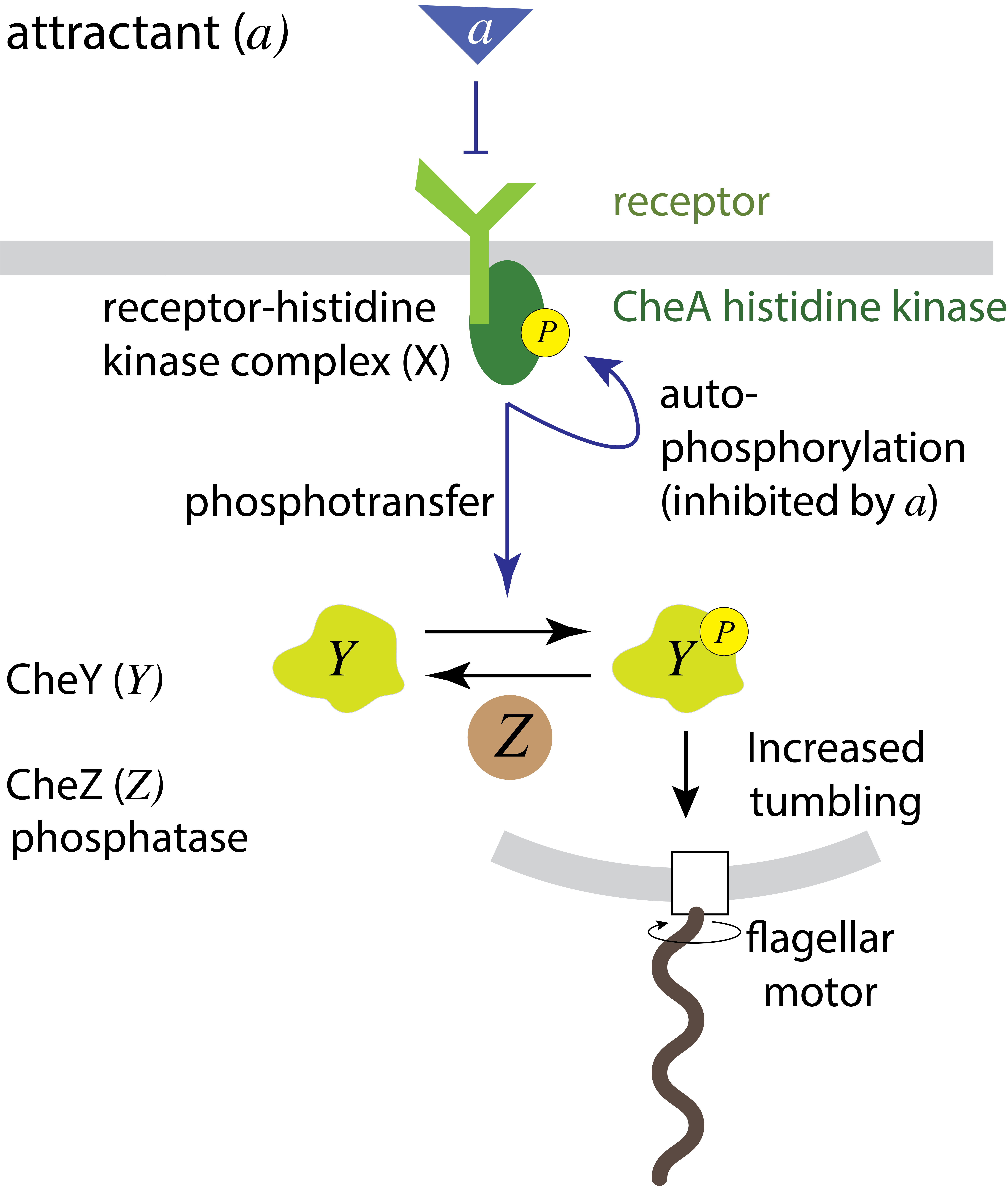 The CheA receptor complex, which we shall call X, consists of one of a family of chemotaxis receptors that recognize different ligands (attractants or repellents). The receptor associates with the CheA histidine kinase. Signaling begins with autophosphorylation of CheA. The rate of autophosphorylation depends on whether the associated receptor is or is not bound to its ligand. For an attractant receptor, ligand binding reduces CheA autophosphorylation.