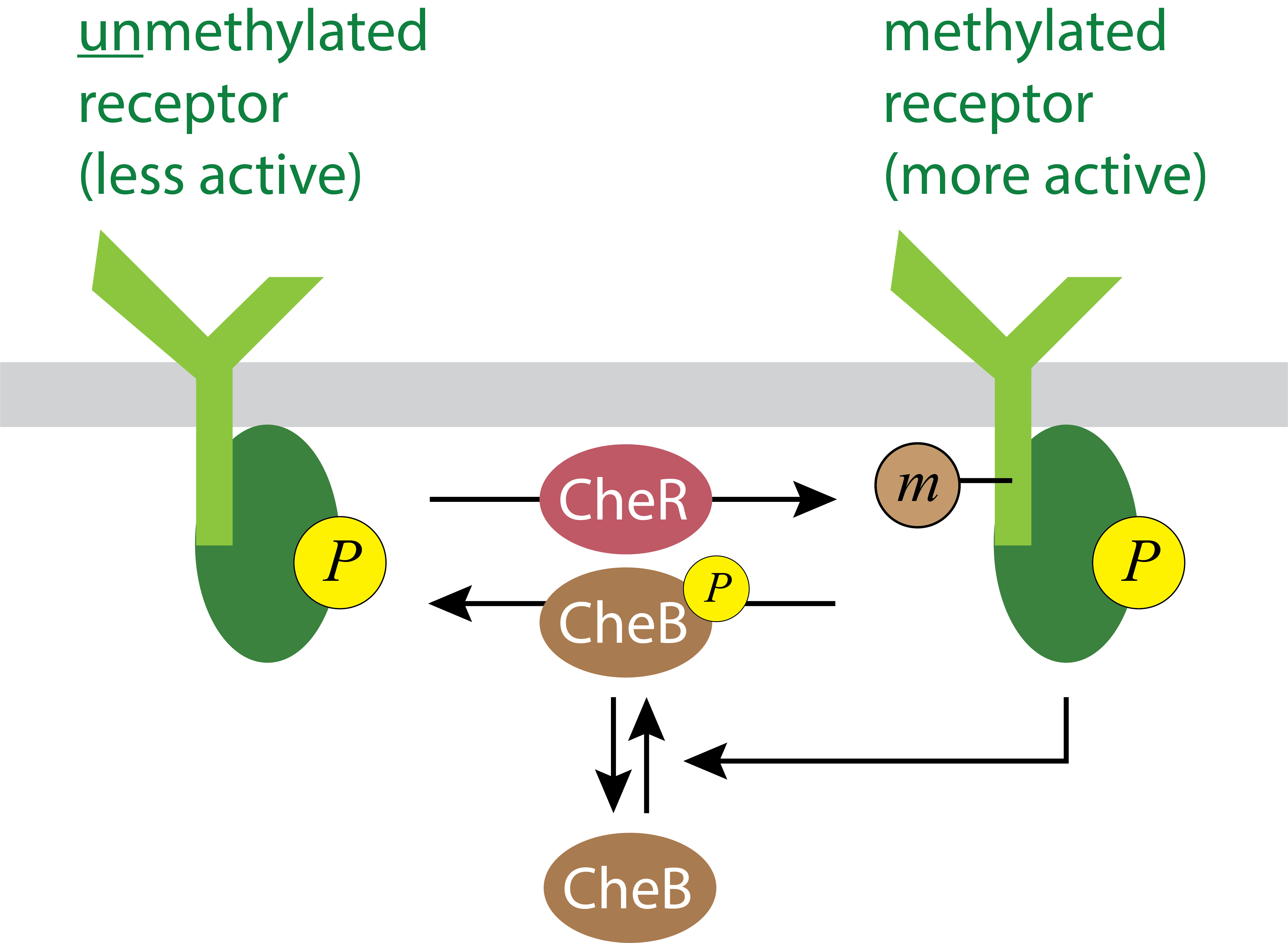 Molecularly, the mechanism for adaptation involves a second, and distinct control mechanism, based on receptor methylation. Two enzymes, CheR and CheB respectively methylate and demethylate chemotaxis receptors, with methylation increasing receptor activity. (See Parkinson, et al., 2015 for a review of the molecules involved in the circuit.)