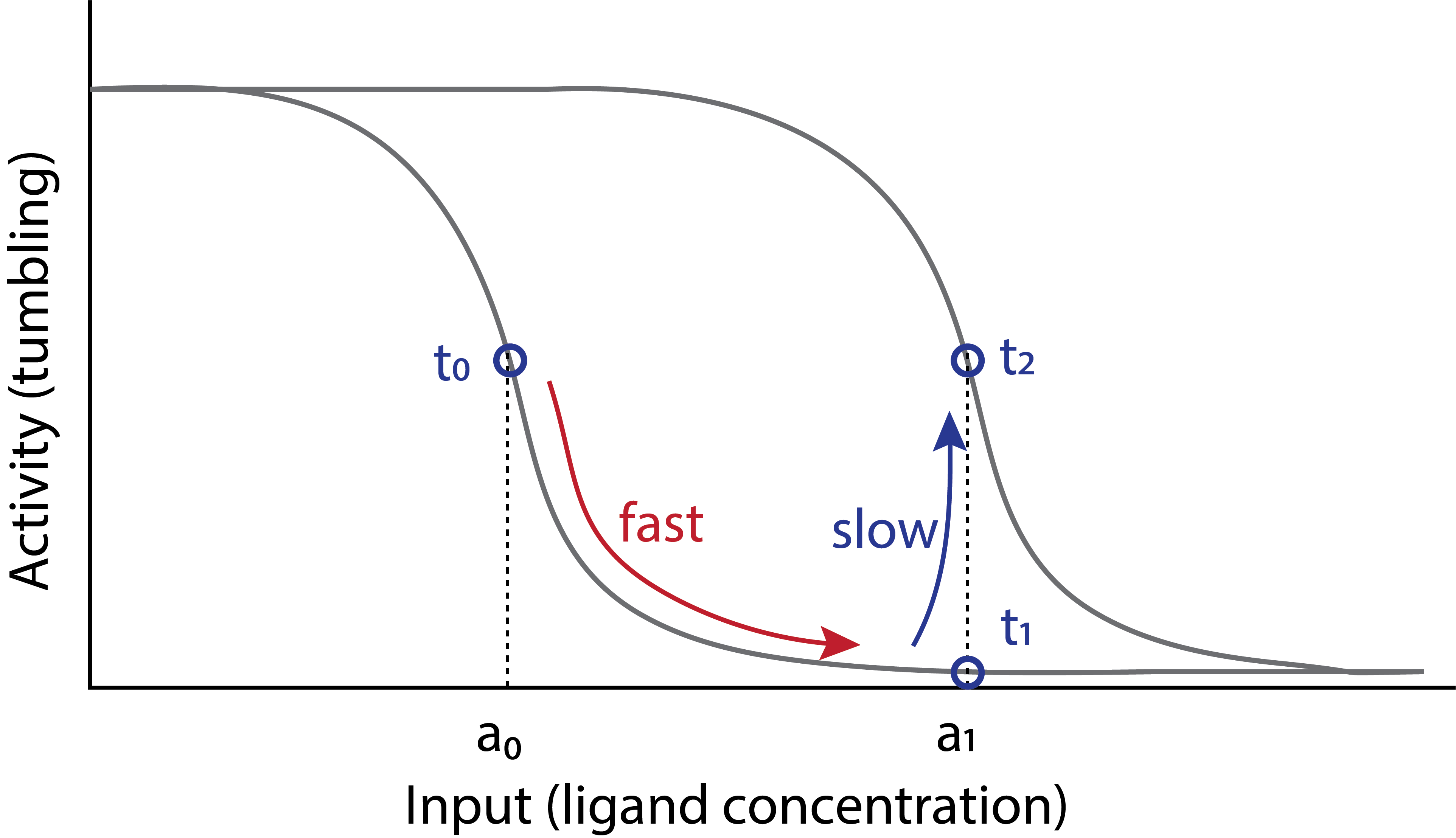 In this picture, the ligand concentration directly and rapidly controls the tumbling frequency, but provides no obvious means of adaptation. A slower process must then change the ligand response curve so that the new ligand concentration produces the same activity as the previous one did. This is illustrated in the following diagram, adapted from a review by Yuhai Tu (Tu, 2013). This diagram depicts a sequence of events: initially, at \(t_0\), the cell is happily swimming and tumbling at an intermediate tumble frequency, and a constant level of attractant, \(a_0\). Suddenly, at \(t_1\), it encounters an elevated attractant concentration, \(a_1\). Its tumbling frequency rapidly drops, following the grey input-output response of the signal transduction system. Over a slower time scale of minutes, however, the input-output curve itself shifts to the right. At that point, \(t_2\), the response to \(a_1\) has returned to the same value it had for \(a_0\) before the shift, i.e. at \(t_0\). This is adaptation in action.