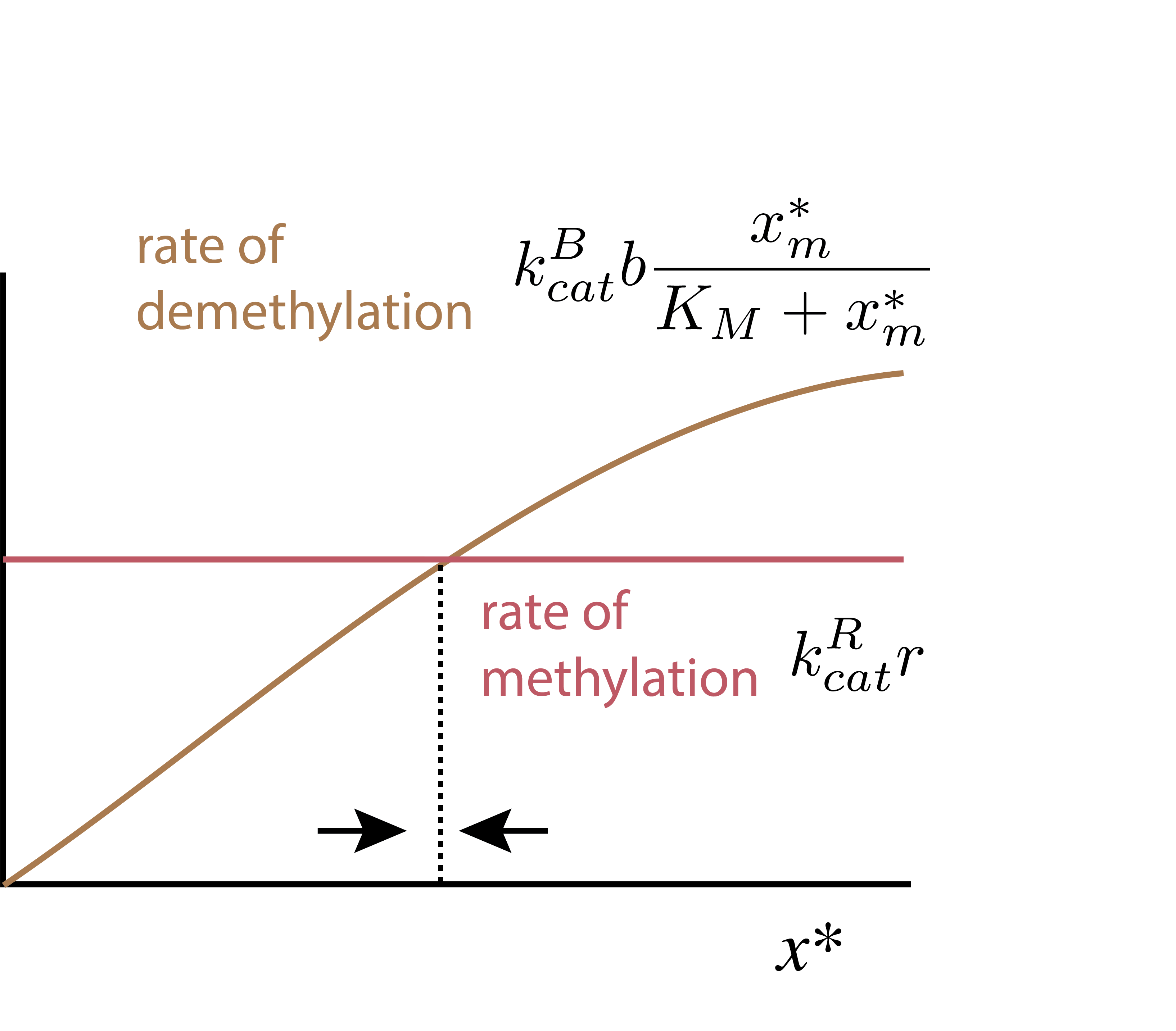 \[ \begin{align} k_\mathrm{cat}^\mathrm{B}\,b_0\,\frac{x_m^*/K_\mathrm{M}}{1 + x_m^*/K_\mathrm{M}} = 2k_\mathrm{cat}^\mathrm{R} r - k_\mathrm{cat}^\mathrm{B} b_0\,\frac{x_m/\kappa_m}{1 + x_m/\kappa_m} \equiv v_\mathrm{demeth}^*. \end{align} \tag{6.4}\]