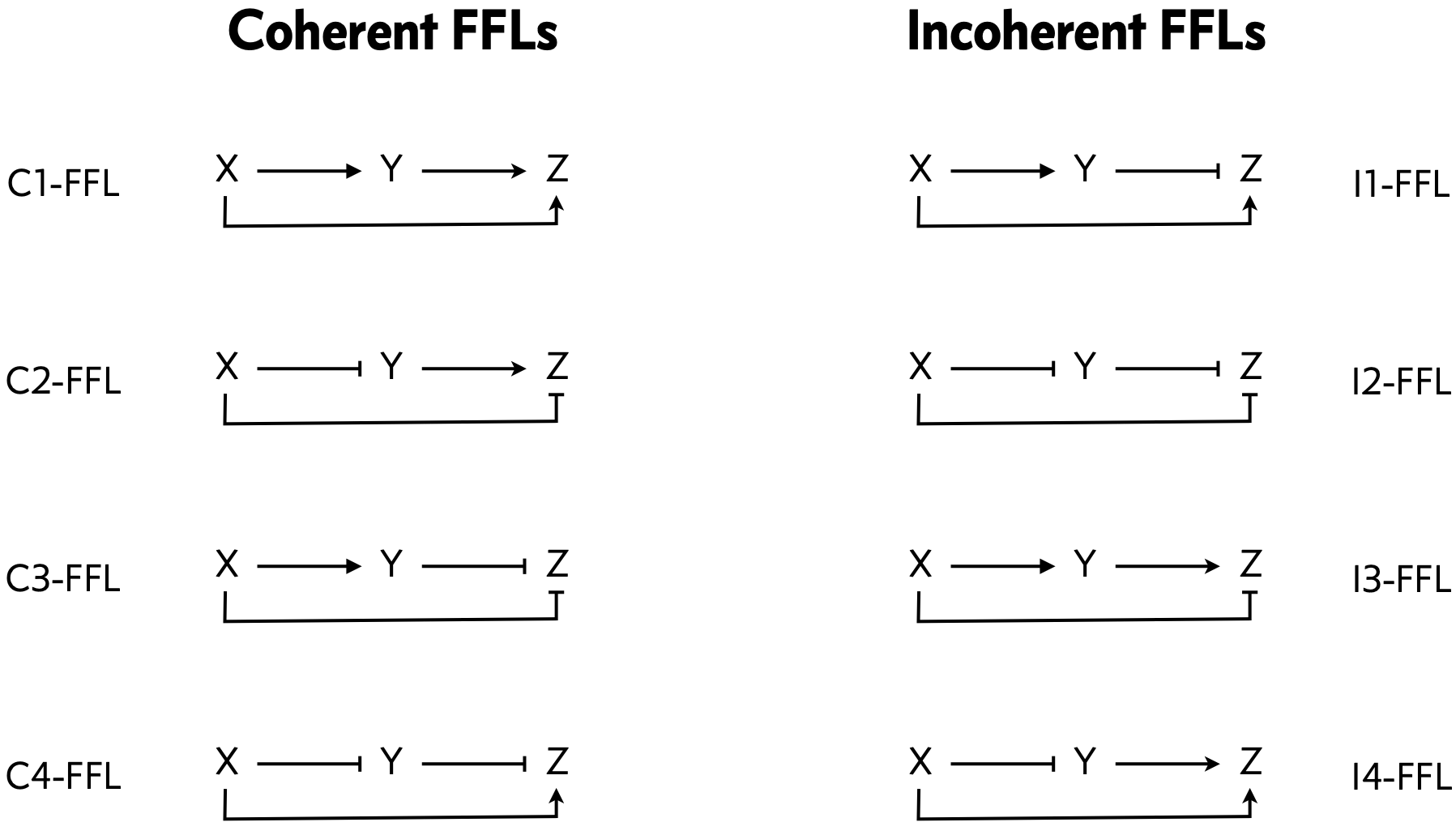 In this classification, half of the FFL architectures are coherent, meaning that X’s direct regulation of Z and its indirect regulation of Z are of the same type, both activating or both repressing. the other half are incoherent, meaning that the direct and indirect regulatory paths have the opposite sign.