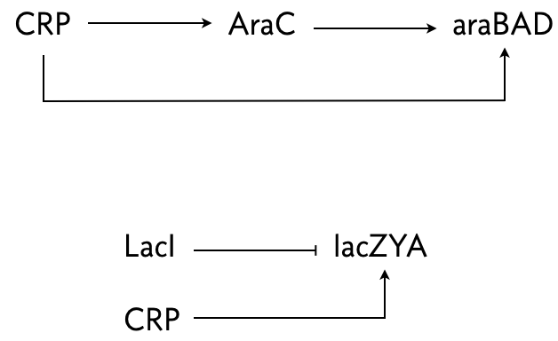 The arabinose and lac systems in E. coli are both turned on by cyclic AMP (cAMP), which stimulates production of CRP, but they have different architectures, shown below.
