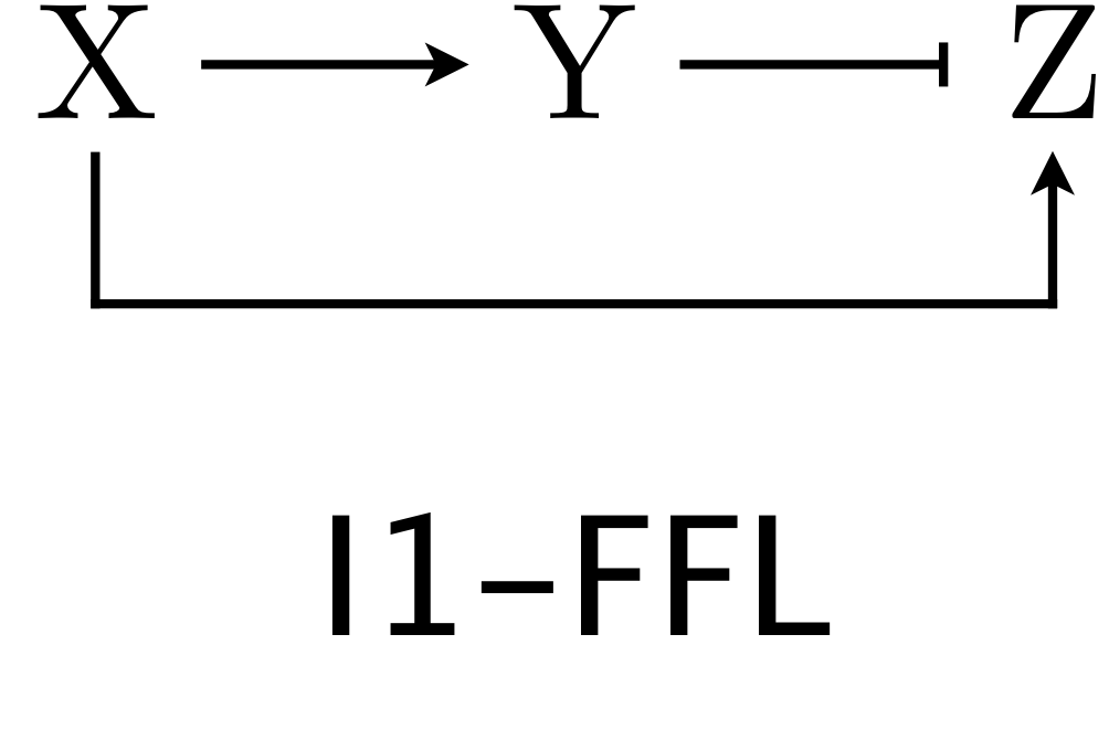 We now turn our attention to the other over-represented circuit, the I1-FFL. As a reminder, here is the structure of the circuit.