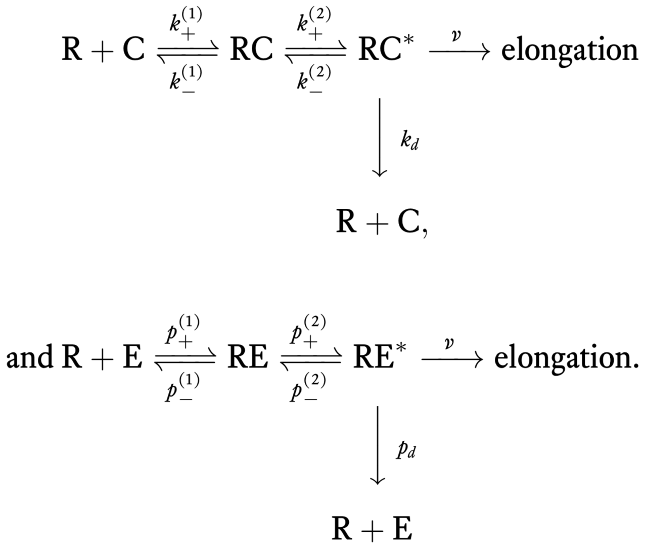 \[ \begin{align} \require{mhchem} \ce{R + C <=>[k_+^{(1)}][k_-^{(1)}] RC}, \end{align} \tag{9.2}\]