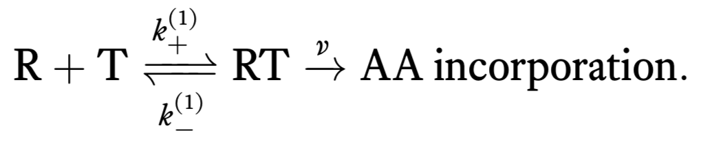 We can think of the process of translation as consisting of two successive steps. First, a tRNA (T) reversibly associates with the ribosome/mRNA complex (R). When associated, an amino acid can be irreversibly added to the nascent peptide. This is represented by the following reaction scheme.