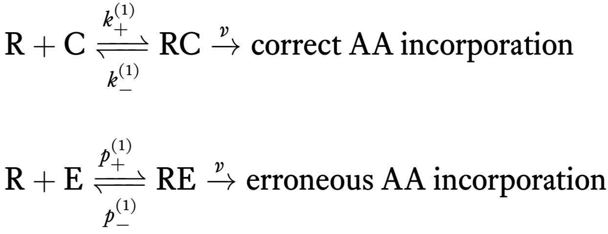 Experimentally, it is known that there are intermediate steps in translation. In 1974, John Hopfield’s big insight was that these steps require energy (e.g., GTP hydrolysis involving the elongation factor EF-Tu), and can therefore serve to decrease the error rate since the energy serves to overcome the limit set by thermodynamics ((Hopfield 1974)). These hydrolysis events can cause a conformational change in the tRNA-codon complex that allow elongation and also for dissociation of tRNA from the codon. For this scheme, the chemical reactions are
