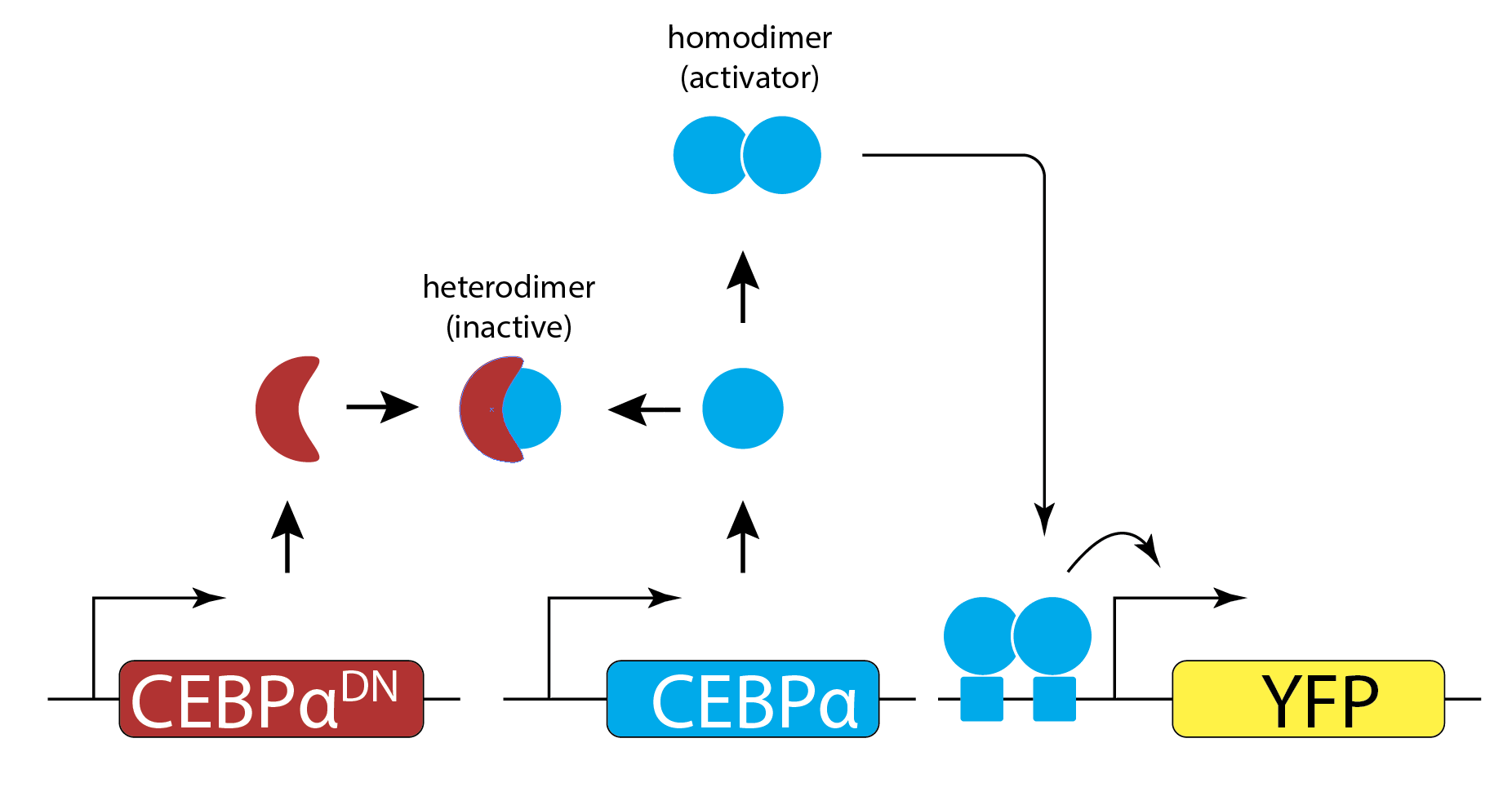 They engineered yeast cells to express a transcription factor, a stoichiometric inhibitor of that factor, and a target reporter gene to readout the level of the transcription factor. As a transcription factor, they used the mammalian bZip family activator CEBP/\(\alpha\), which homodimerizes to activate target genes, and does not exist in yeast. As the inhibitor, they used a dominant negative mutant of CEBP/\(\alpha\) that binds to it with a tight \(K_\mathrm{d} \approx 0.04\) nM to form an inactive complex. As a reporter, they used yellow fluorescent protein expressed from a CEBAα-dependent promoter. To vary the relative levels of the activator and inhibitor, they expressed each of them from a set of distinct promoters of different strengths. The entire circuit was integrated in the yeast genome. As a control, they also constructed yeast strains without the inhibitor.