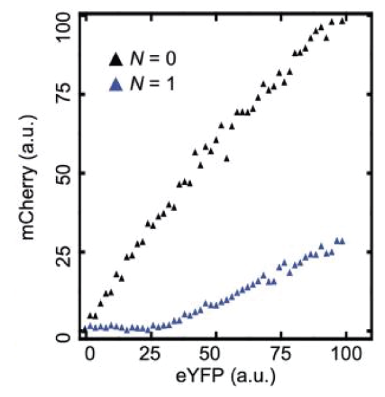 Here, the YFP x-axis is analogous to our \(a_\mathrm{tot}\), above, while the mCherry y-axis is analogous to \(a\).
