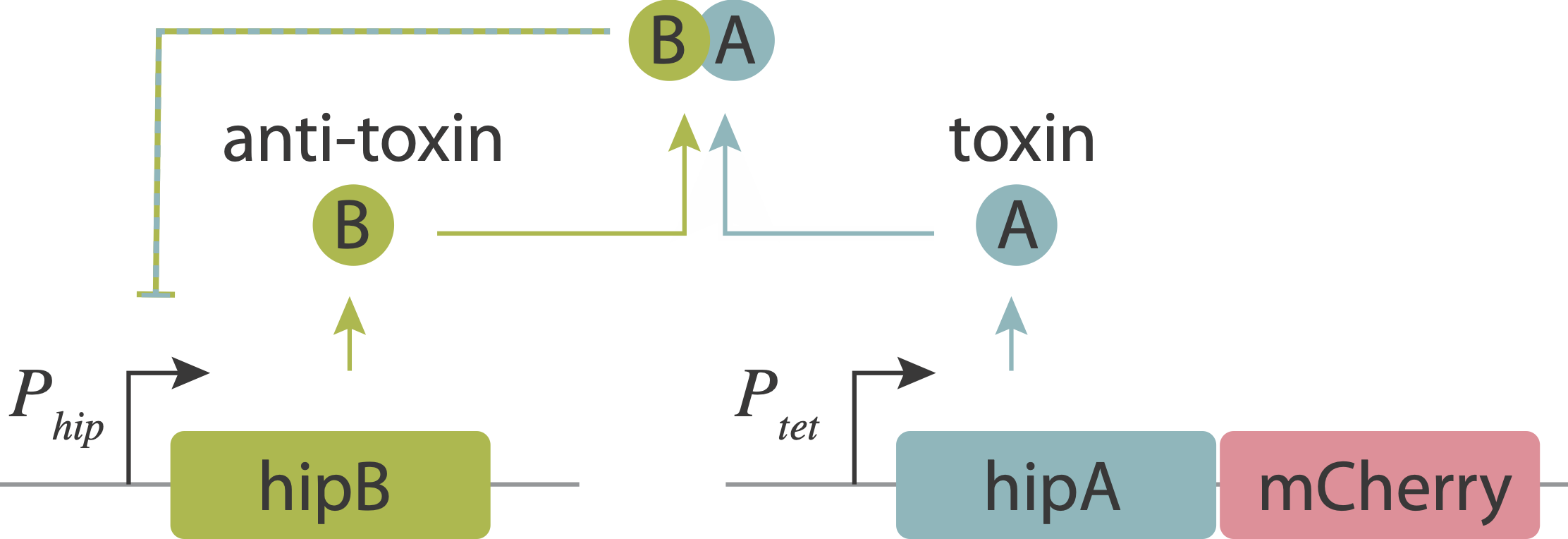 In an upcoming chapter, we will analyze a phenomenon known as antibiotic persistence, in which individual bacteria spontaneously and stochastically enter slow-growing persistent states that tolerate antibiotics, even in the absence of those antibiotics. One such system in E. coli is controlled by the hipAB circuit, which comprises a toxin protein, HipA, and a cognate anti-toxin, HipB. The two proteins are expressed from a single operon. They form tight complexes that also act to repress their own promoter. If the levels of the HipA toxin exceed those of the HipB anti-toxin, for example due to stochastic fluctuations in expession, it can trigger a transition into the persistent state.