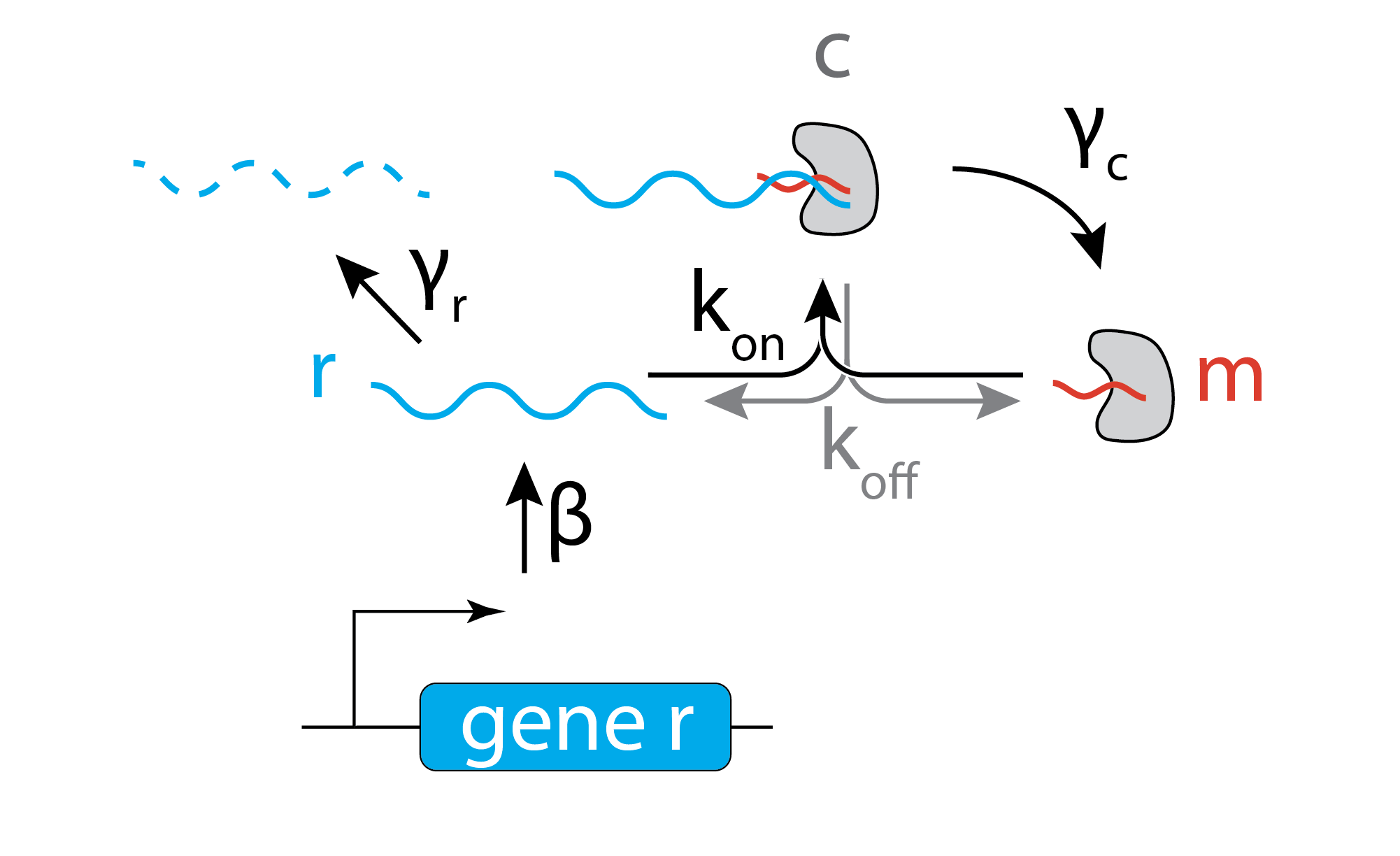 &\frac{\mathrm{dr}}{\mathrm{d}t} = - k_\mathrm{on} r m + k_\mathrm{off} c - \gamma_r r + \beta \\[1em]