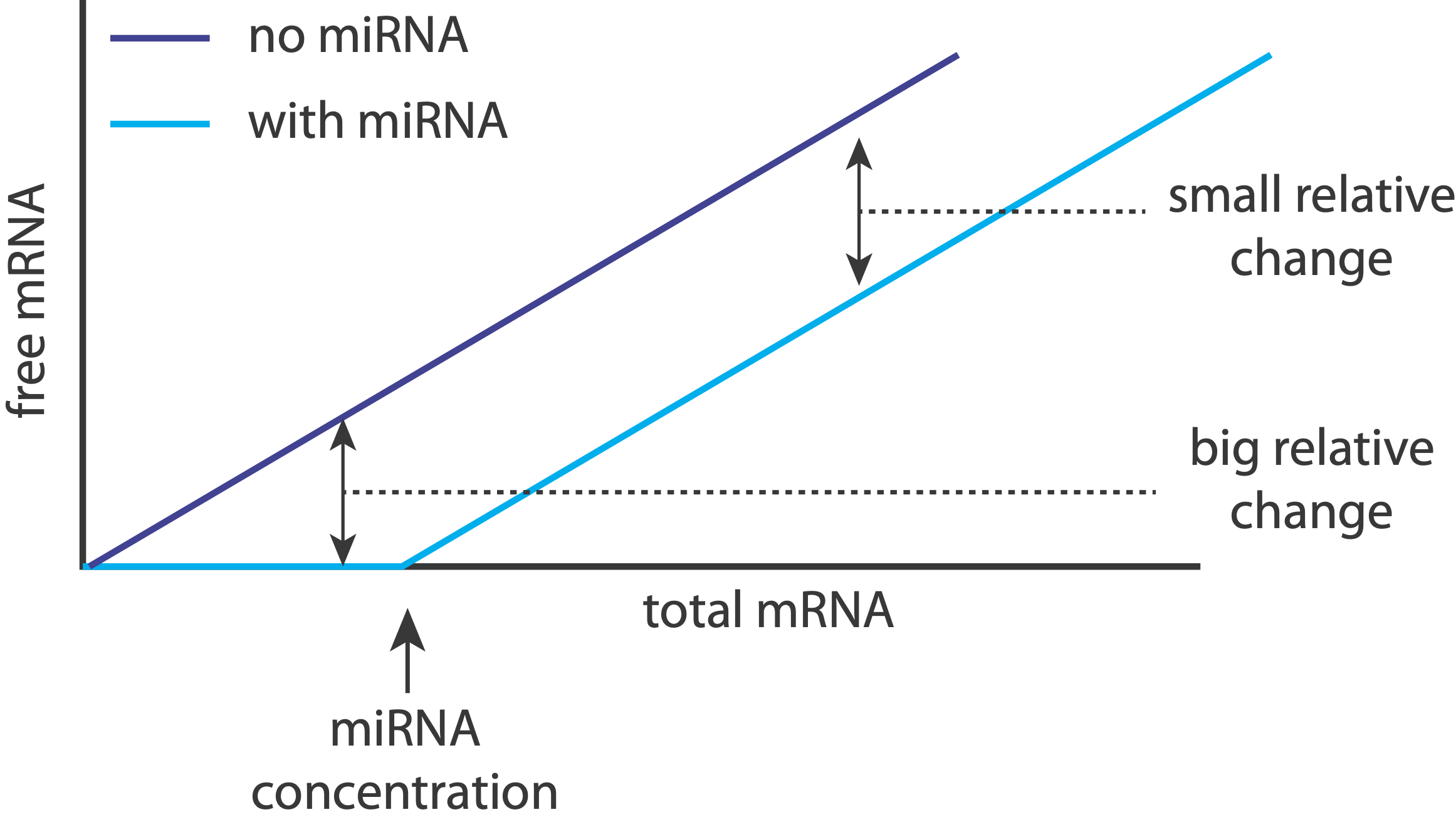 That makes sense: when miRNAs are unsaturated, they can have a relatively strong effect on their target expression levels, essentially keeping them “off.” On the other hand, when targets are expressed highly enough, the relative effect of the miRNA on expression becomes much weaker, effectively just shifting it to slightly slower values.