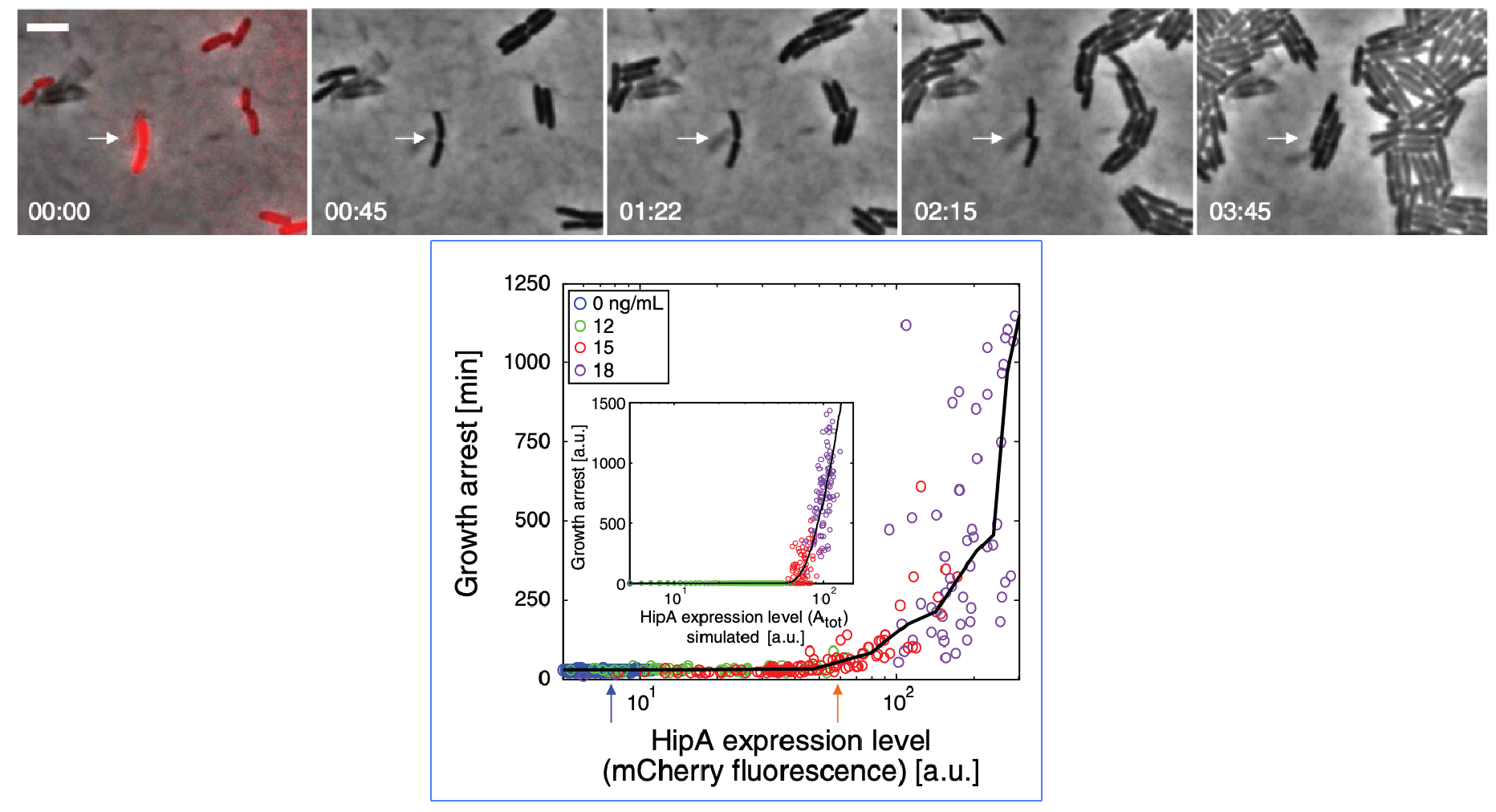 They then used time-lapse movies to correlate the growth behavior of individual cells with their HipA protein levels. As shown in these panels, cells with higher levels of mCherry showed delayed growth. Analyzing these data quantitatively revealed (drumroll, please) a threshold relationship, in which growth arrest occurred when HipA (as measured by its fluorescent protein tag) exceeded a threshold concentration:
