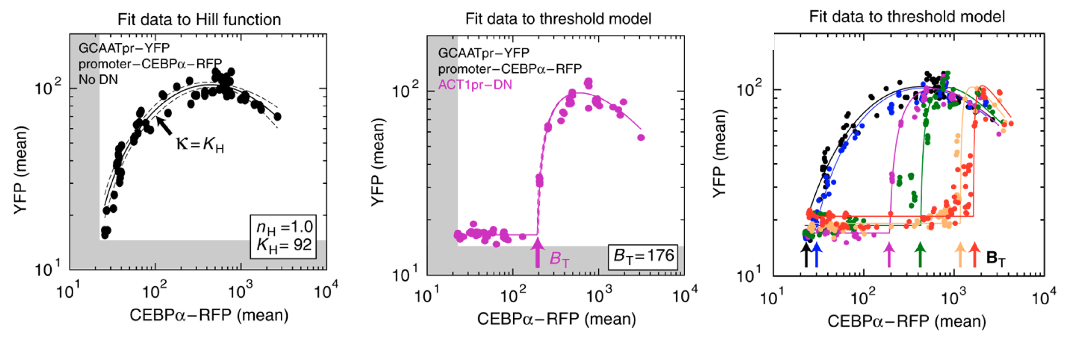 By contrast, when they also expressed the inhibitor at a fixed concentration, \(b_\mathrm{tot}\) (middle panel), they observed no induction of YFP for concentrations of CEBPα lower than \(b_\mathrm{tot}\). When CEBPα level exceeded \(b_\mathrm{tot}\), however, YFP levels rapidly increased. This threshold linear response resembled those predicted in the model. (Squelching can be observed in this plot as well.)