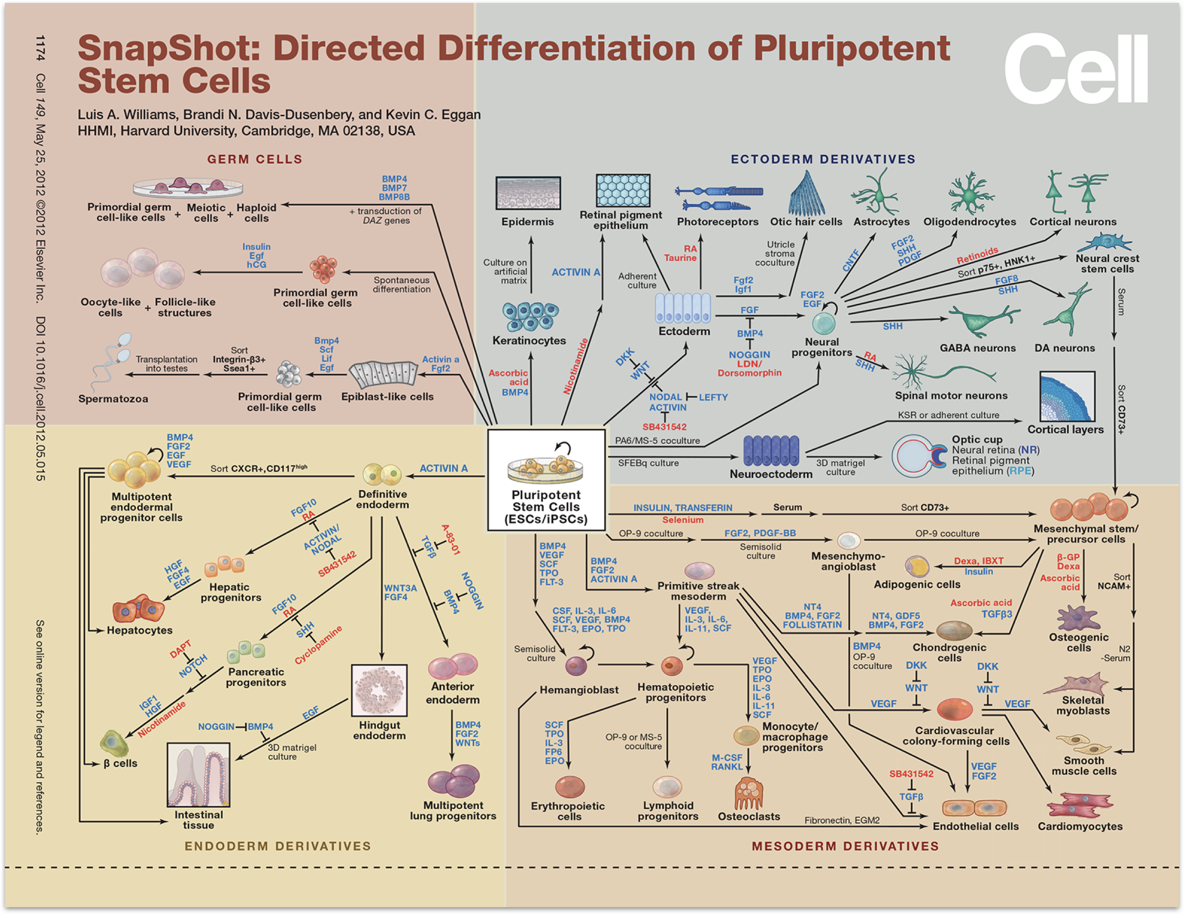 In parallel with these developments, in order to treat disease, the fields of stem cell biology and regenerative medicine have identified procedures that direct stem cells to differentiate into desired cell fates. One strategy is to recapitulate in a cell culture dish the signals that cells are likely to receive in the embryo as they differentiate into the fate of interest. This involves stimulating or inhibiting fate-controlling signaling pathways such as Notch, Wnt, Sonic hedgehog, FGF, EGF, BMP (which we covered in a previous chapter) and others, in specific sequences. A sense of the power and breadth of these approaches can be gleaned from this wall chart, published by Cell in 2012. Since then, these approaches have continued to become ever more powerful.