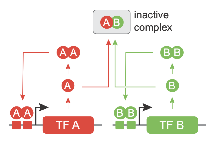 We will start by analzying a minimal version of the MultiFate architecture, termed MultiFate-2, comprising just two transcription factors, which we label A and B. A and B can each form homodimers. They can also heterodimerize with one another. The homodimers positively activate their own gene, while heterodimers are inactive. The reason that homodimers can activate their own genes, while the corresponding monomers cannot is that the DNA binding site for the dimer is effectively double the length of that of the monomer, providing approximately twice the binding energy.