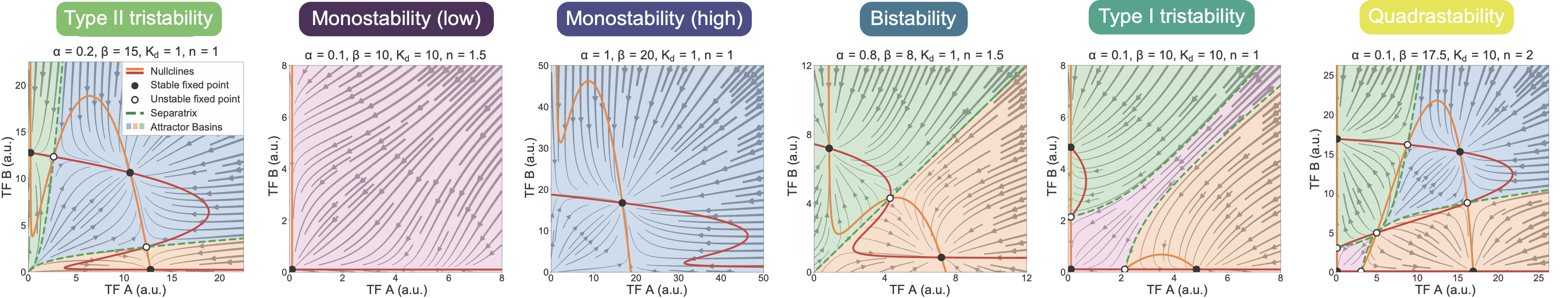 bokeh.io.show(p)The separatrices mark the boundaries between the basins of attraction, as expected. You can see how trajectories that start on different sides of the separatrix approach different stable fixed points. Using this approach, it is possible to plot the MultiFate-2 phase portrait in a range of different parameter regimes. By doing so, one can see that this simple circuit can produce a wide array of different stability behaviors, from monostability to quadrastability: