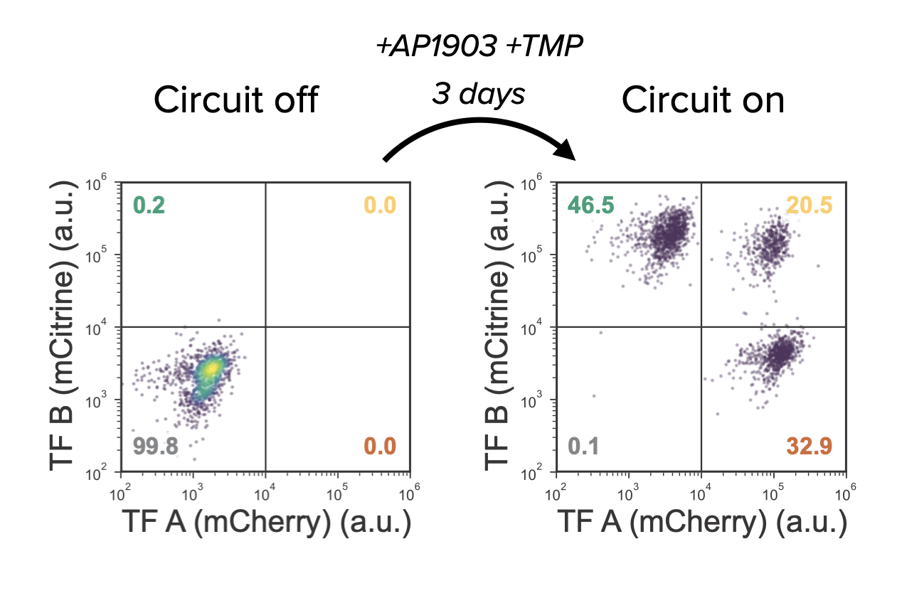 With these cells, the moment of truth was at hand: would MultiFate-2 provide multistability? When the cells were cultured without the inducers, both proteins were quite low, as seen in flow cytometry measurements. But when AP1903 and TMP were added to turn on dimerization and stabilize the proteins—voila!—the cells shifted into three distinct clusters: