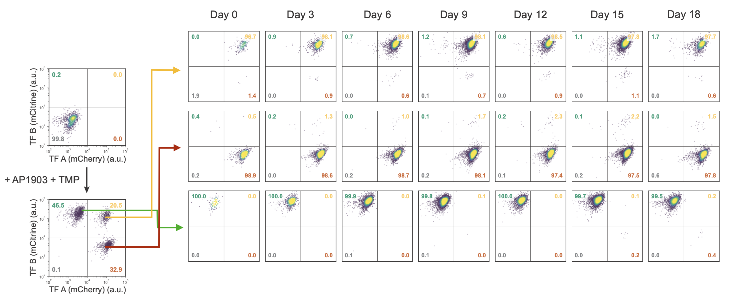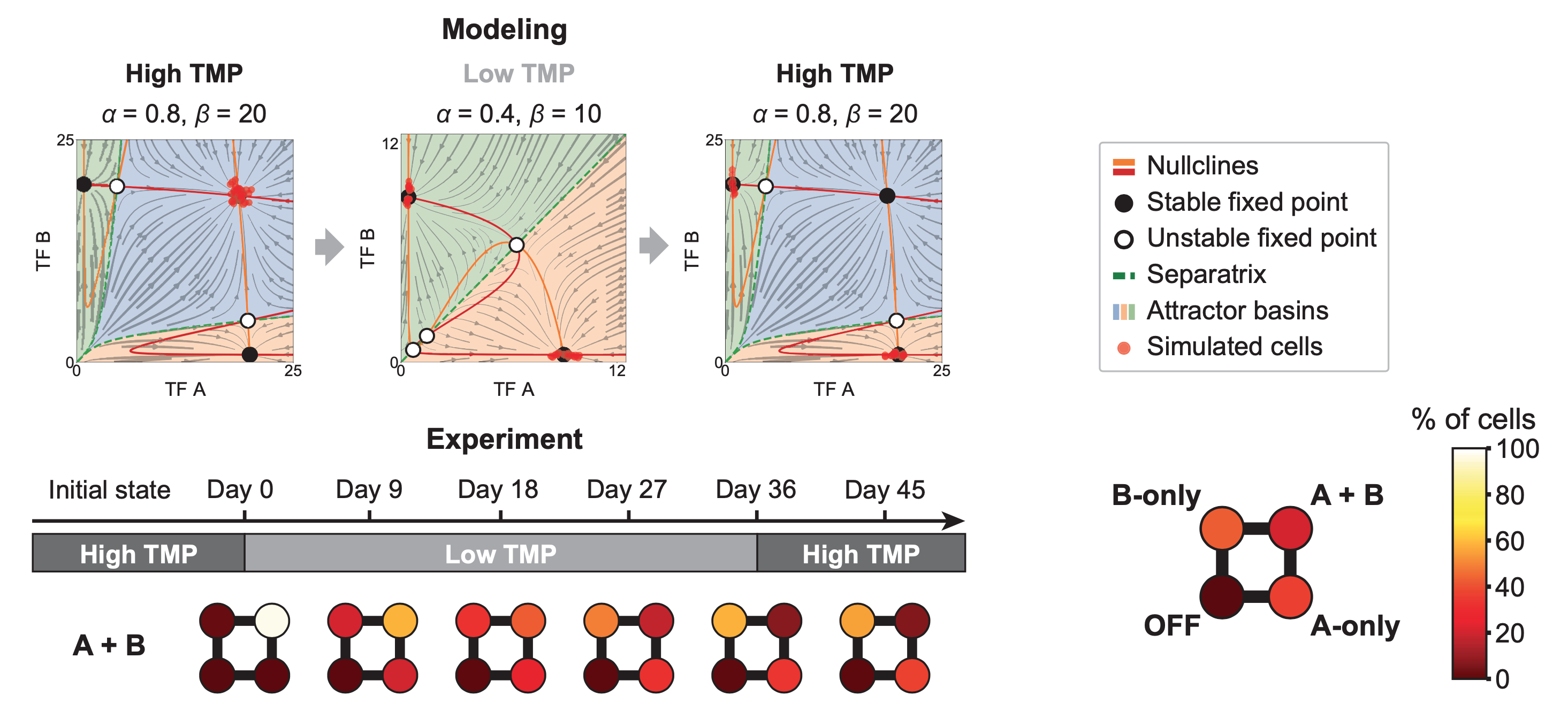 Remarkably, the same behavior occurs in the real cells as well. In the following diagram, the four circles represent the fraction of cells in states that have low or high expression of gene A (x-axis) or B (y-axis). You can see the AB state depopulating at low TMP and not re-populating when TMP is restored.