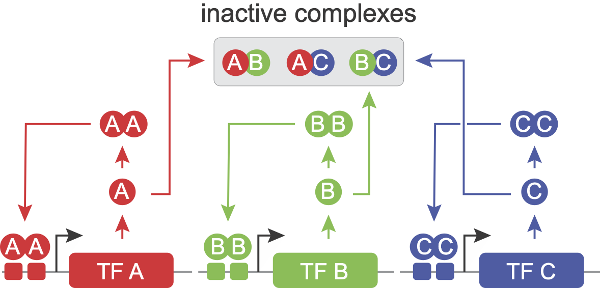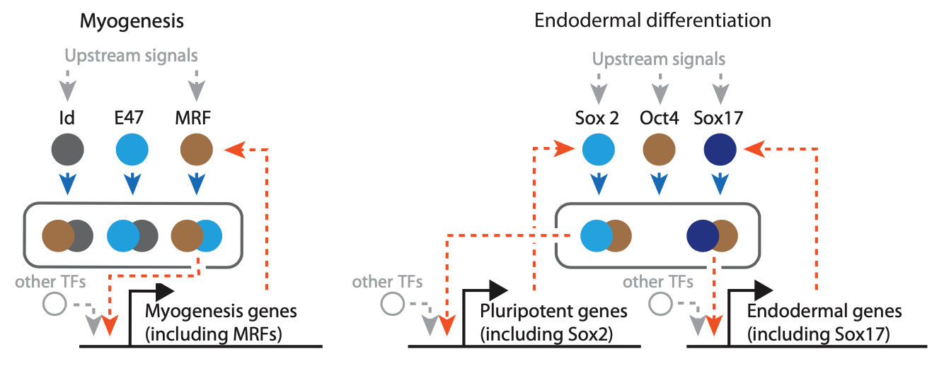 For example, in the circuit controlling muscle cell differentiation, the master transcription factor MyoD can dimerize with Id or E47. The MyoD-Id dimer is inactive. But te MyoD-E47 dimer transcriptionall activates many genes involved in myogenesis, including MyoD itself. Similarly, embryonic stem cells can remain in a “pluripotent” state in which they have the potential to differentiate into virtually all cell types in the embryo. The circuit that controls this state includes the key transcription factor Oct4, which can dimerize with either Sox2 or Sox17. Sox2-Oct4 and Sox17-Oct4 respectively activate expression of Sox2 and Sox17, generating autoregulation.