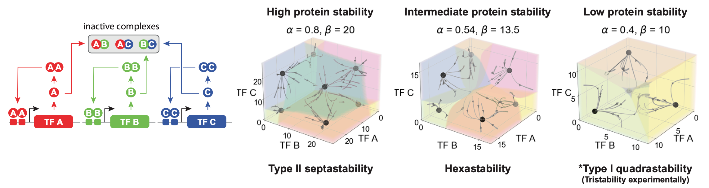 Having demonstrated that a 2-gene MultiFate circuit exhibits the desired stability and controllability properties for a differentiation circuit, Zhu et al. then demonstrated the MultiFate architecture’s expandability by constructing and measuring the performance of a 3-gene MultiFate circuit. Through mathematical modeling they were able to determine that the 3-gene circuit could exhibit septastability (the coexistence of seven stable fixed points), and through experimental measurements they were able to determine that cells that started in each of these seven states persisted within these states for at least 18 days in the absence of external control signals.