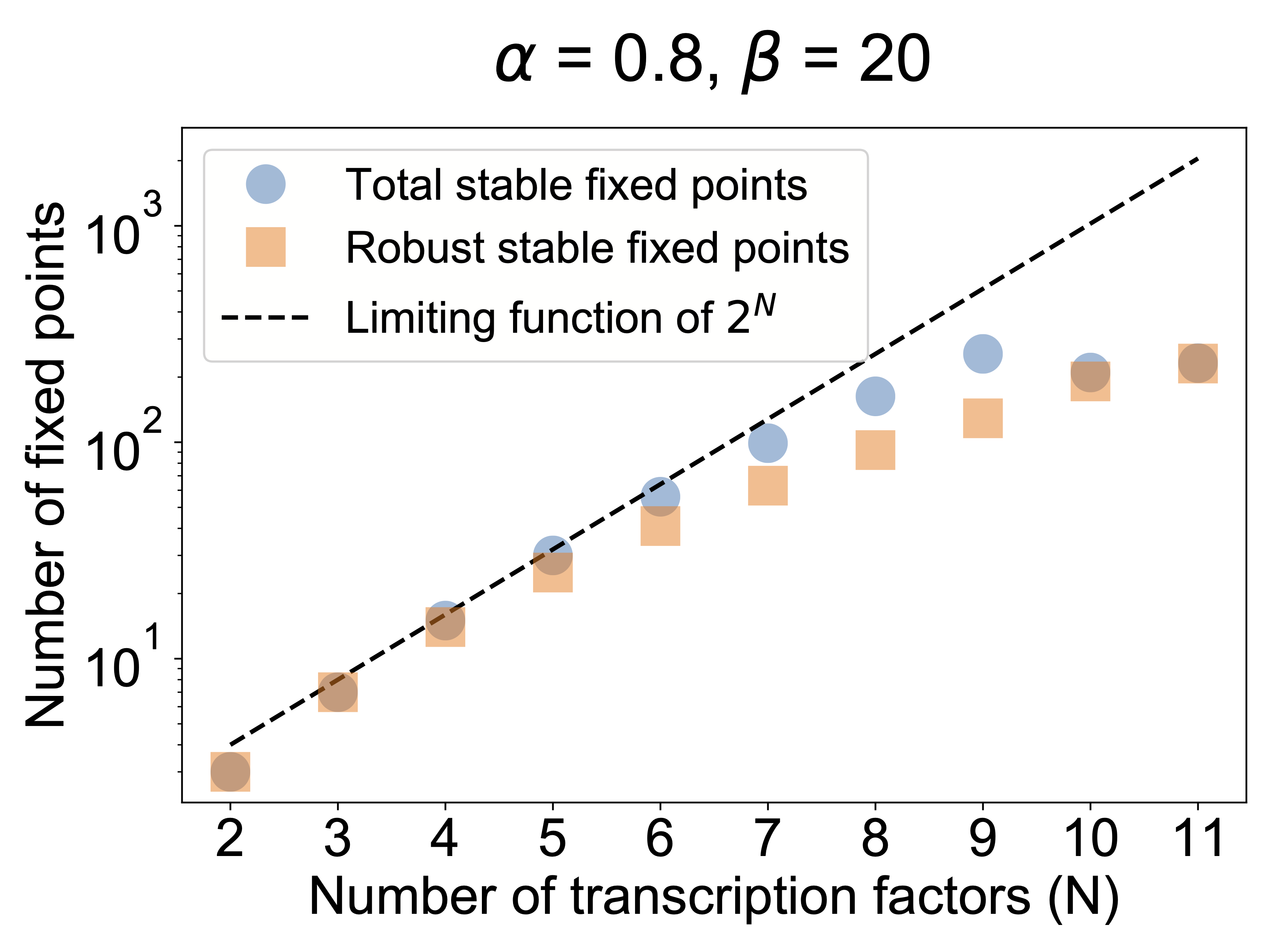 A final question we can ask in the model is how far can MultiFate scale? How many states can it generate? To address this question, one can analyze MultiFate models with increasing numbers of transcription factors. In addition to counting the number of stable fixed points, we can also quantify the relative sizes of their basins of attraction to make sure they are really accessible. Zhu et al performed this analysis. As shown in the next plot, the number of states initially grows exponentially with the number of factors. Eventually it starts to saturate. The reason for this turns out to be interesting. In the MultiFate architecture, only the homodimers are active. For a state with a certain number, \(m\) of transcription factors simultaneously expressed, there are \(~m^2\) dimer complexes but only \(m\) of those are active. So the fraction of all species that are active decreases as \(~1/m\). This eventually limits the total number of states. Nevertheless, for the parameters in the model, it still reaches hundreds of states!