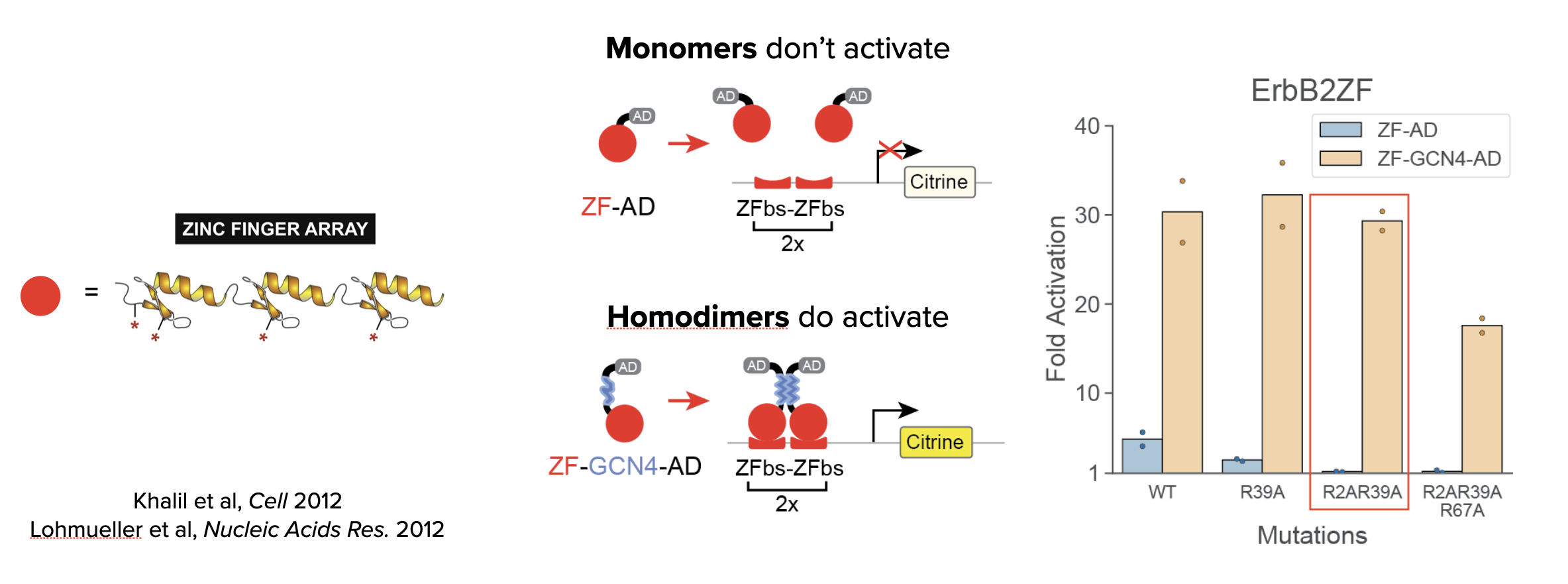 In MultiFate, only the homodimers activate. To achieve this, the authors took 3-finger proteins that recognize 9bp target sites, and fused them to a transcriptional activation domain. As shown schematically (below, middle), 9bp is too short for efficient binding by the monomeric proteins. However, further incorporating a homodimerization domain caused the proteins to pair up as homodimers that efficiently recognize the combined 18bp double target site, and therefore activate efficiently. In fact, the homodimers activated more strongly than the monomers (leftmost pair of bars, below right). Furthermore, incorporation of a additional mutations in the DNA binding domains reduced activation by the monomers while preserving activation by the homodimers. In particular, notice how two arginine to alanine mutations (R2AR39A) reduced activation by monomers but not dimers.