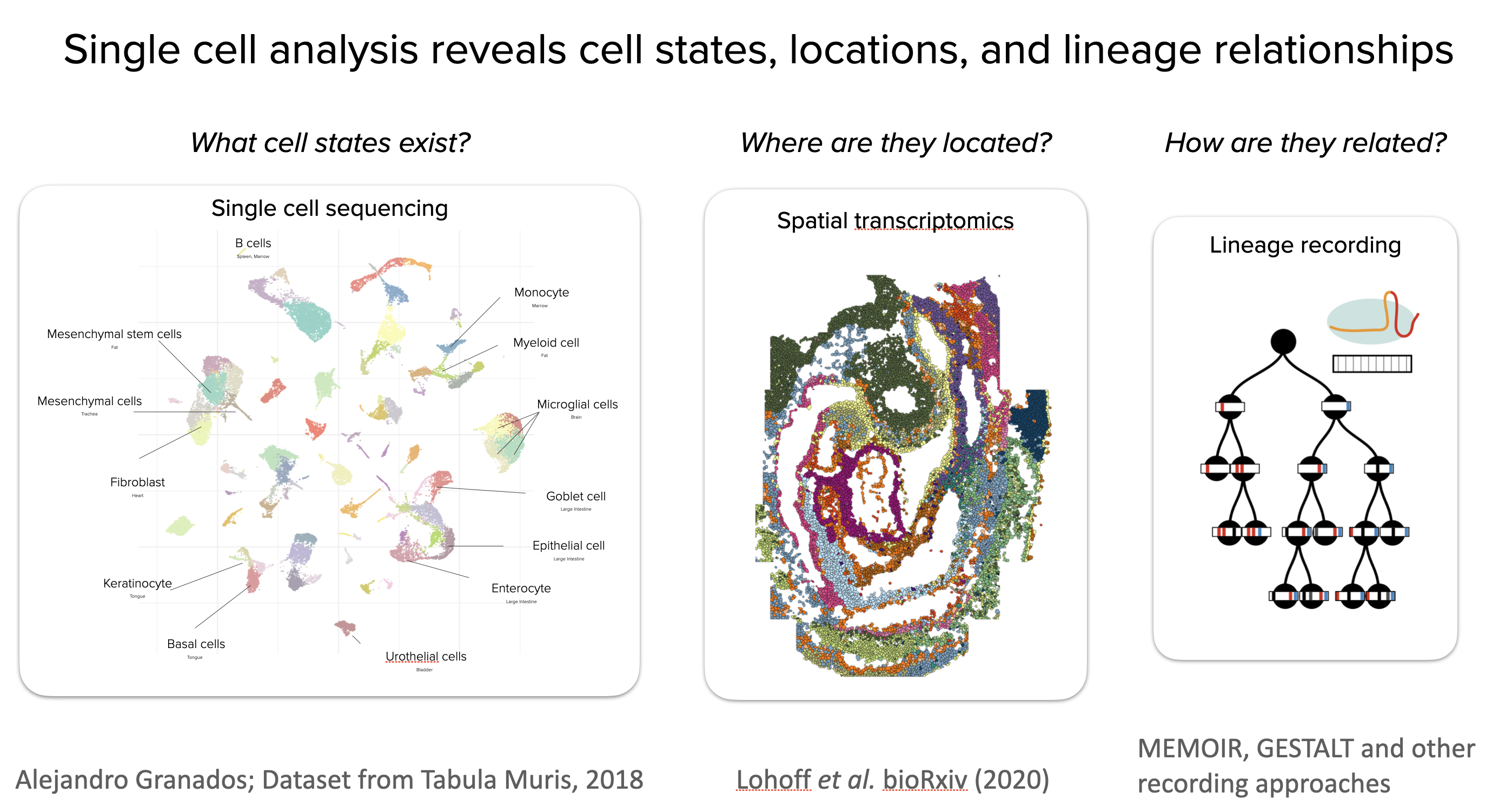 The late 2010s and early 2020s have witnessed a revolution in our understanding of cell states. Single cell “omics” techniques like single-cell RNA sequencing (scRNAseq) have revealed the molecular states of individual cells, allowing the creation of “cell atlases” of entire adult organisms. Spatial transcriptomics approaches have further shown where cells in those states are located within complex spatially organized tissues. Furthermore, emerging molecular recording techniques such as GESTALT, MEMOIR, and others are beginning to reveal the lineage relationships of individual cells, revealing how cells reached their fates. As a result, we have begun to learn what states exist, where they are located, and how they arose.