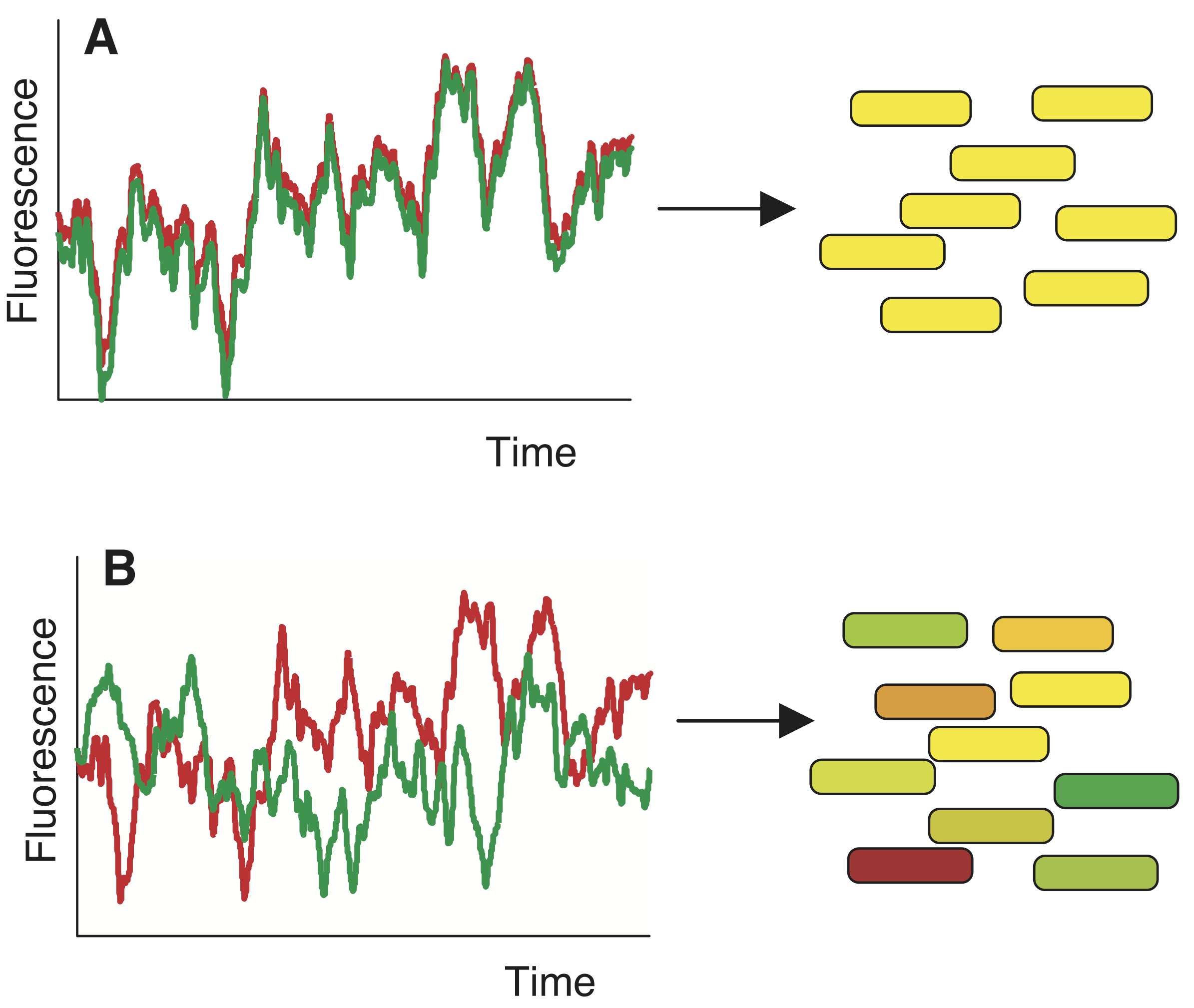 While we cannot put two identical cells in the same environment, we can put two (nearly) identical genes in the same cell. This is conceptually related, and allows us to think of these two genes as two independent stochastic samples of the same underlying process. If gene expression is a deterministic process that is influenced by the state of the cell, then both copies of the gene should “feel” the same intracellular environment and behave identically over time, as in panel A of the image below. Some cells may be more efficient at transcribing or translating genes, but that condition should effect both colors similarly. On the other hand, if the process of transcription or translation is noisy, then expression of each gene could fluctuate independently, producing very different levels of the two proteins in the same cell, as in panel B.
