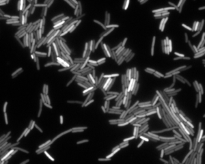 A major leap in our understanding of how variation originates occurred in 1994, when the gene coding for the green fluorescent protein of Aequorea victoria jellyfish was cloned and expressed in other organisms by Martin Chalfie and colleagues. Suddenly it became possible to follow gene expression in individual living cells. Discoveries that were previously impossible now became inevitable, and nowhere more so than in the study of noise. Green fluorescent protein and a growing palette of multi-colored derivatives revealed heterogeneity directly. For example, in the image below, we see individual E. coli cells, each expressing yellow fluorescent protein (YFP) under control of the LacI promoter. Although these cells come from a clonal population, they vary vary dramatically in their fluoescent intensity. This provides a direct view of heterogeneity in the expression of a single gene.
