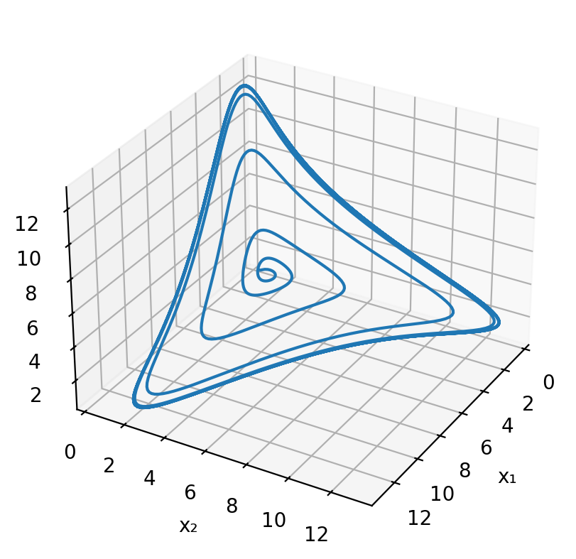 # We can do with with Bokeh a viz.js, but for now, we use Matplotlib# Resolve problem for β = 20 and n = 3t = np.linspace(0, 50, 1000)x = scipy.integrate.odeint(protein_repressilator_rhs, x0, t, args=(20, 3))# Generate the plotfig = plt.figure()ax = fig.add_subplot(111, projection="3d")ax.view_init(30, 30)ax.plot(x[:, 0], x[:, 1], x[:, 2])ax.set_xlabel("x₁")ax.set_ylabel("x₂")ax.set_zlabel("x₃");