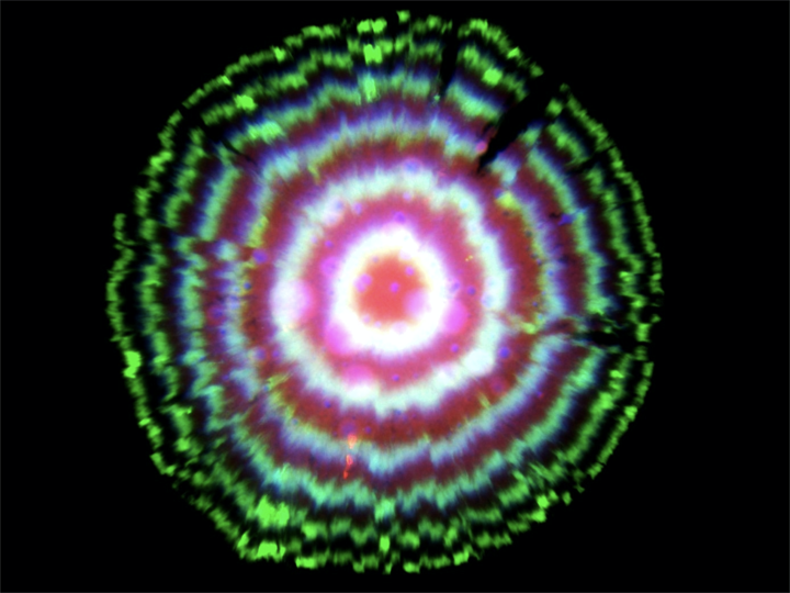 The dilution-based repressilator circuit is so precise that even though cells are not synchronized with one another, they stay in sync over many generations of growth. When the cells grow as a colony on a plate, most growth occurs at the leading edge of the colony. Behind that front, cells stop growing, effectively leaving a record of the state of their repressilators at each point in time, somewhat like tree rings, as shown in this image (red, green, and blue channels show fluorescence from three reporters, one expressed with each repressor):