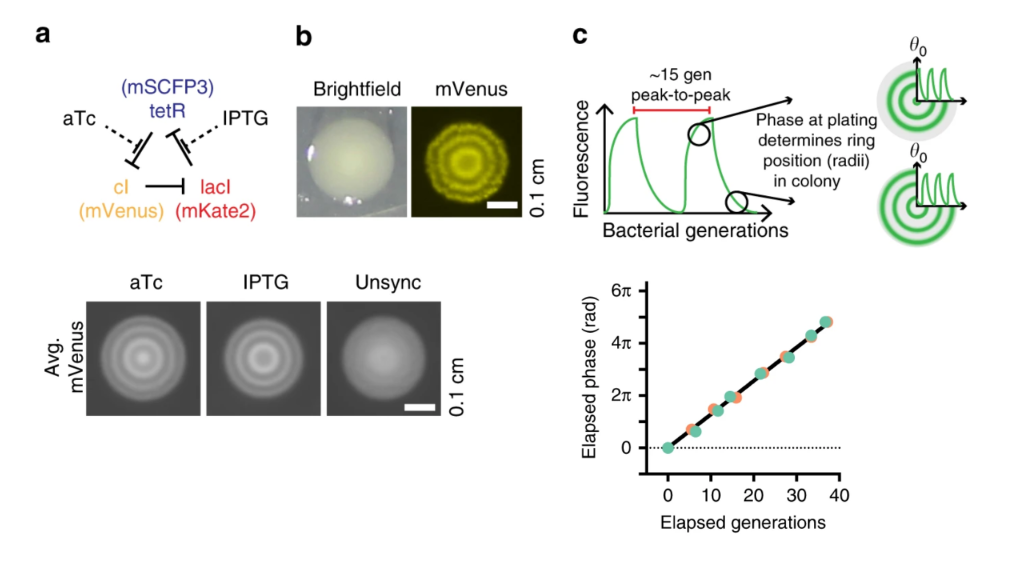 The approach of Riglar and coworkers relied on the ability to read out repressilator phase from colony ring phases. More specifically, they found that the phase of the repressilator in the initial cell that seeded the colony controls the radial phasing of the rings in the colony. Cells that are plated at the peak of reporter fluorescence produce colonies with a high intensity “dot” at the center, whereas cells plated at the trough of the oscillations have rings shifted by 180 degrees. This is shown schematically in part c of the image below. They also took advantage of the ability to modulate the phase of the repressilator directly with two small molecule drugs, anhydrotetracycline (aTc) and IPTG, which respectively inhibit TetR and LacI proteins (a, below). After using these drugs to synchronize a population of cells at one phase, they could observe a beautiful linear relationship between the repressilator phase (as determined by the phasing of colony rings) and the elapsed growth of the cells (bottom-right plot, below). Further, they verified that it was really growth and not time per se that correlated with phase (see Figure 3 of the paper).