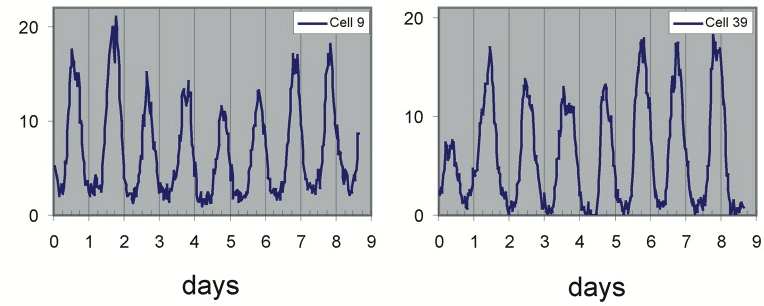 Time traces of individual cells from this movie show periodic 24 hour oscillations: