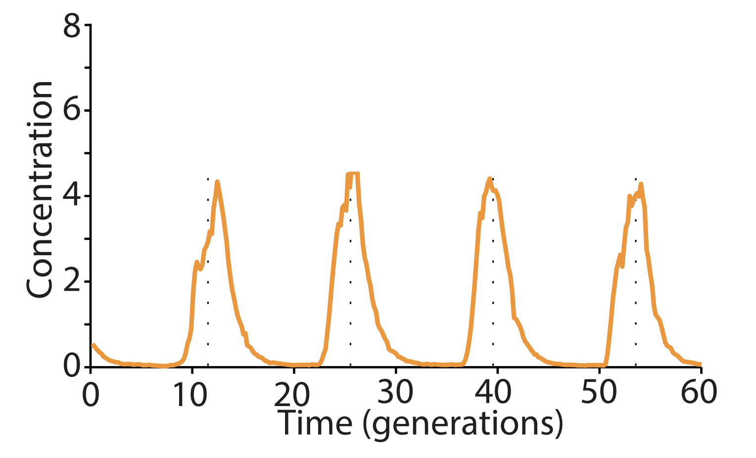 Eliminating enzymatic degradation makes the repressilator an astonishingly precise clock. Finally, an additional source of variability stemmed from fluctuations in the enzymatic protein degradation machinery. This source of variation could be circumvented by reducing the amounts of repressor made, or more dramatically by eliminating their degradation altogether, allowing dilution to dominate protein removal. Without protein degradation, oscillation periods stretched out to as much as 14 cell cycles. However, their precision increased dramatically, with a standard deviation in period duration of only about 14%, and an incredibly regular pulse shape and amplitude, as you can see in the image below. In fact, the repressilator became so precise that it would take on average 180 cell cycles to accumulate even a half-period of phase drift!