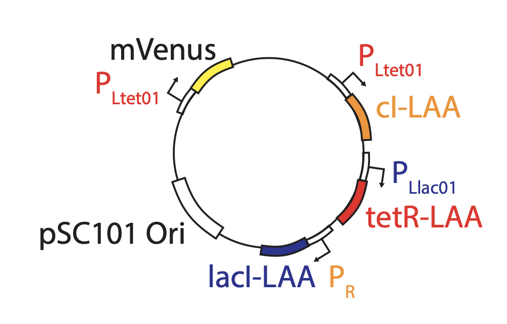 Here, the repressilator consists of three repressors on the low copy pSC101 plasmid, with TetR additionally repressing a green fluorescent protein reporter on the higher copy ColE1 plasmid. The lite suffix on the repressors signifies that they have a destruction tag to decrease their stability. The aav suffix on the GFP indicates that it incorporates a less active degradation tag variant.