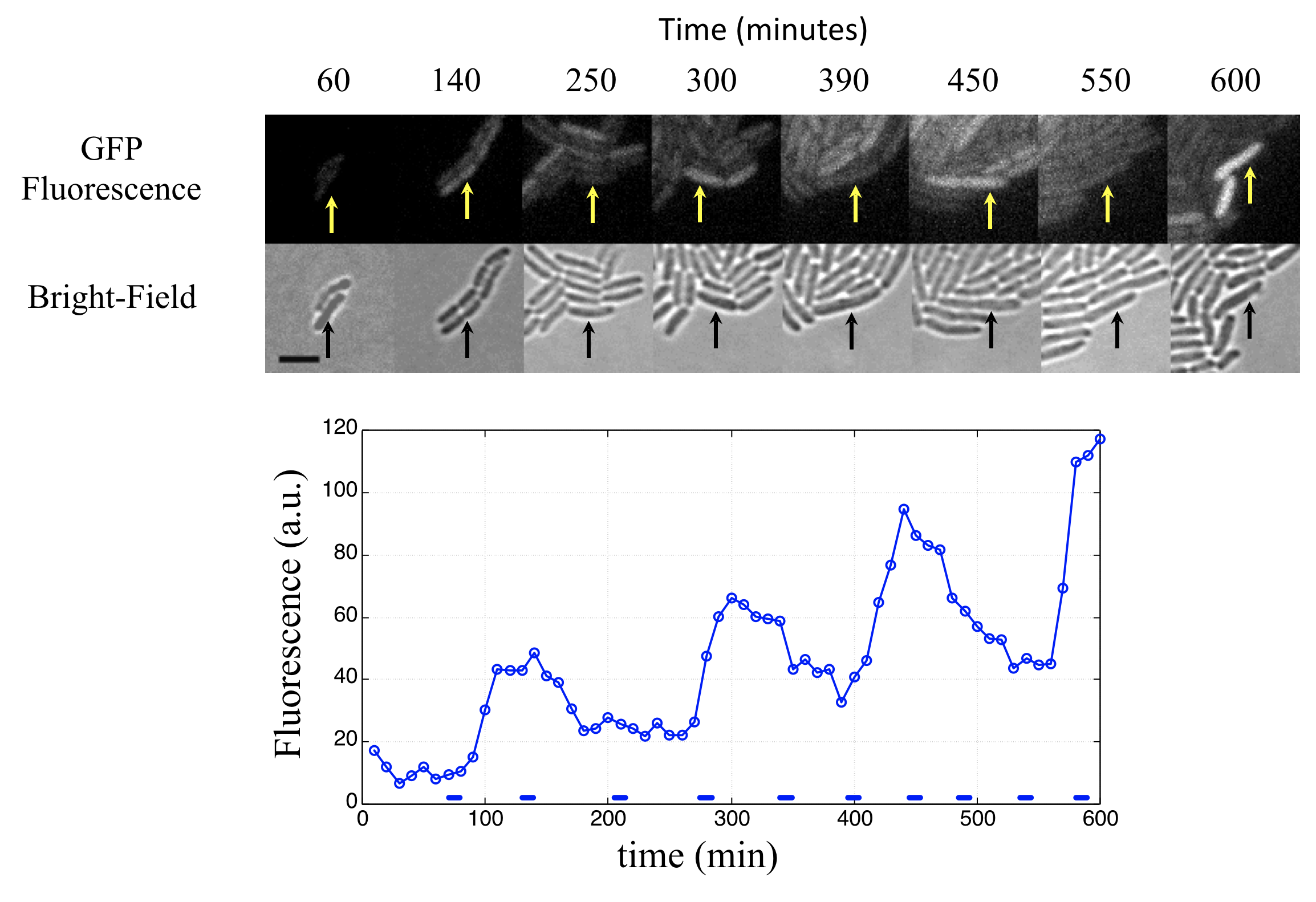 To see how the circuit behaved, we used time-lapse imaging to record movies of individual repressilator-containing cells growing into microcolonies. (Lacking automated autofocus systems, one author slept near the microscope with an alarm clock to refocus the microscope every hour, all night long, exemplifying another important role for clocks in science and technology.)