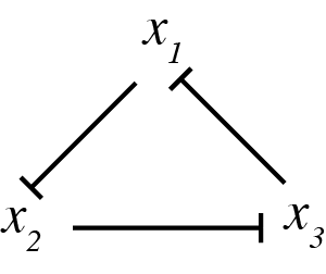 We can try to work out the dynamics of this system by intuitive reasoning. We might achieve a limit cycle oscillation: Say that repressor 1 is present at a high protein concentration, while repressors 2 and 3 are low. The high concentration of repressor 1 will limit expression of repressor 2, keeping its level low. This means that repressor 3 is free to be expressed. As its concentration grows, it will start to repress repressor 1. As repressor 1 goes down, repressor 2 is expressed in higher numbers. The increased repressor 2 concentration leads to less repressor 3. Then, repressor 1 comes back up again. So, we see a cycle, where repressor 1 is high, then repressor 3, and finally repressor 2.