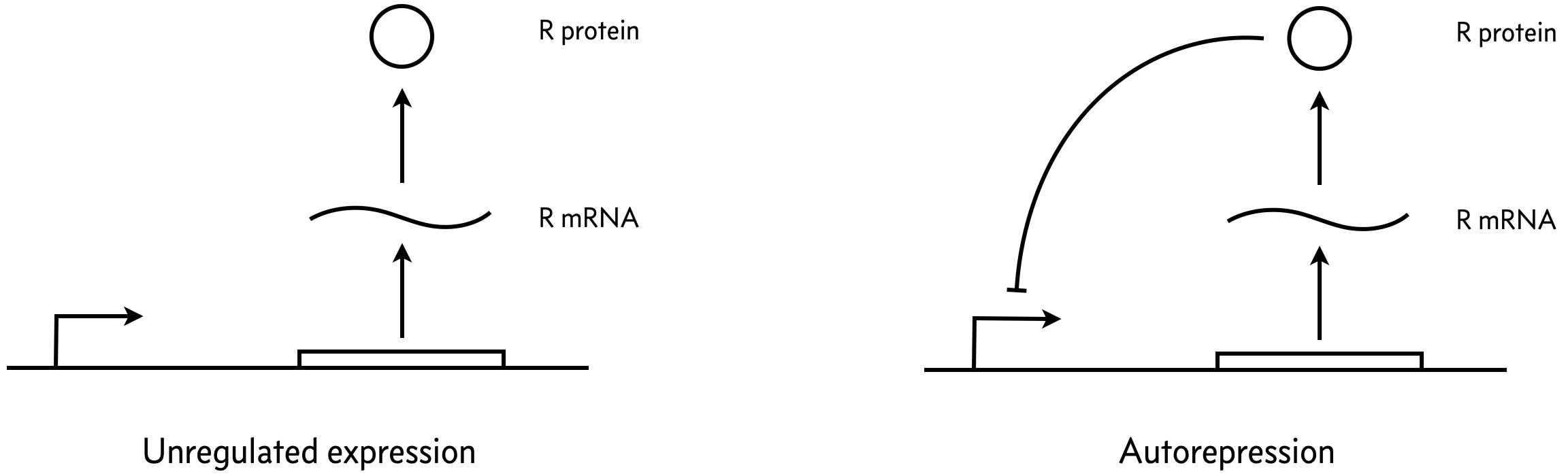 Consider the two simple circuits shown below, where R is a repressor.