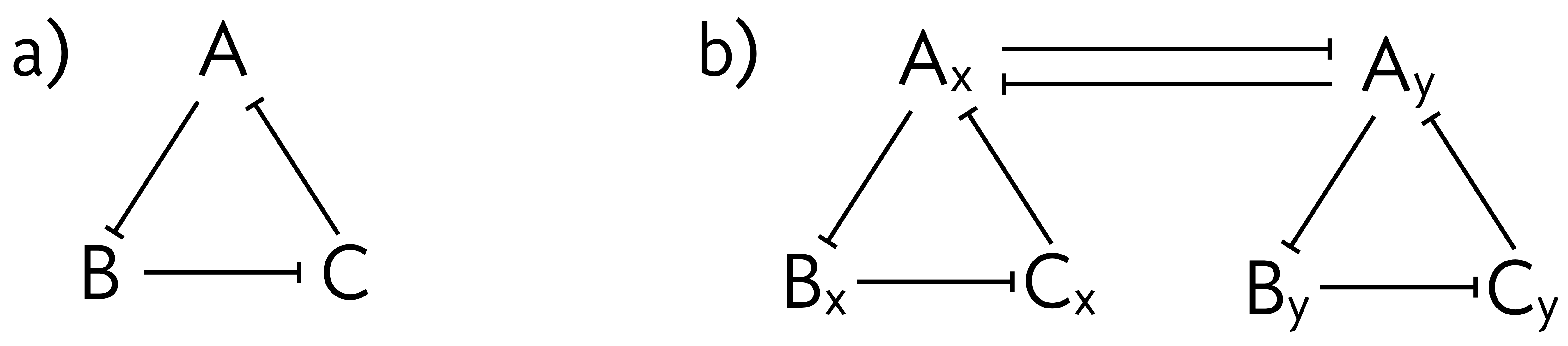 In this problem, we further study the dynamics of the repressilator, with the interesting twist that we will consider two coupled respressilators. A schematic of the repressilator is shown panel (a) of the figure below. Consider now two repressilators, which we will label x and y, that are coupled as in panel (b) of the figure below. For this coupling, we have chosen that gene A in the respective circuits repress their counterparts in the other. \(\mathrm{A}_\mathrm{x}\) and \(\mathrm{A}_\mathrm{y}\) have two repressors acting on them, and we assume if one or both of the repressors are bound (with their respective cooperativity), the polymerase is occluded.