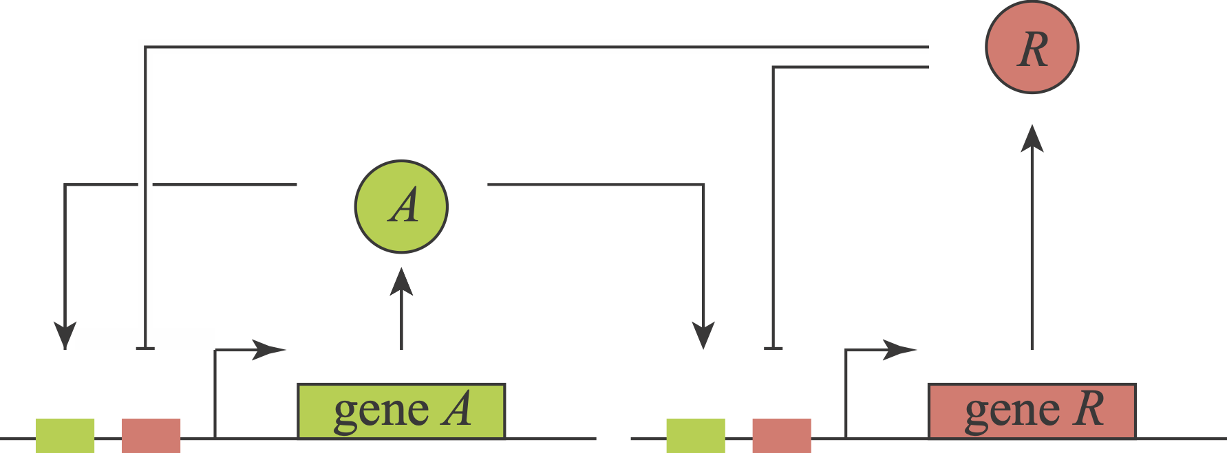 \[\begin{align} &\frac{\mathrm{d}a}{\mathrm{d}t} = \alpha + \beta \,\frac{(\kappa a)^n}{1+(\kappa a)^n +r^n} - \gamma\,a,\\[1em] &\frac{\mathrm{d}r}{\mathrm{d}t} = \alpha + \beta \,\frac{(\kappa a)^n}{1+(\kappa a)^n +r^n} - r, \end{align}\]