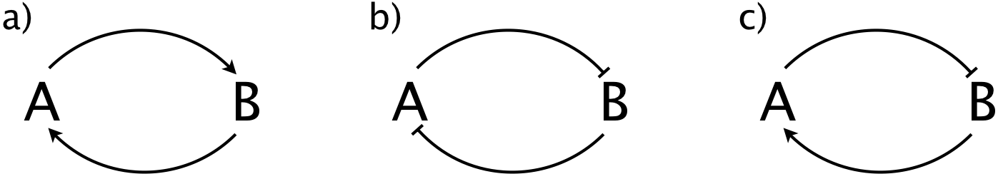 Consider two components, A and B, which regulate each other. A may activate or repress B, and B may activate or repress A. There are three possible architectures in this scenario, two with positive feedback and one with negative feedback, shown below.