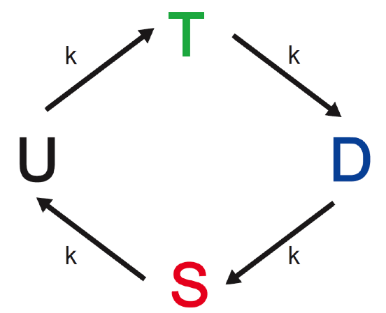 Using mass action kinetics, write down a three-dimensional system of differential equations describing this system, assuming that the total amount of KaiC, \(C_\mathrm{tot} = T + U + D + S\), is constant. I.e., write down a system of ODEs for \(T\), \(D\), and \(S\). Assume that $C_ = $3.4 µM and \(k = 0.116\text{ h}^{-1}\).